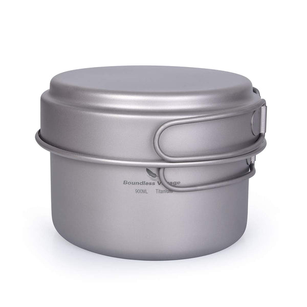 Brand:Boundless VoyageItem: Ti1585B, Ti1586B, Ti1587BMaterial: 99.8% titaniumSurface: titanium original colorDimensions: Pan: (D)134.5 x (H)40 mm, about 73.8 g, 500 ml Small pot: (D)127 x (H)79 mm, about 102.5 g, 900 ml Big pot: (D)112 x (H)119.5 mm, about 123.1 g, 1080 ml Features:? 3 in 1 cookware set: each piece can fit into other piece. Small pot can fit into the big pot, 2 pots can fit into the pan. It is very convenient to carry out. ? Multipurpose: You can cook instant noodles with pot, can also make a soup and other food you like. The frying pan can be used as a cover for pot when you are cooking. Meet most of your needs outside in outdoor activities.? Stripe design of frying pan: you can use this pan to fry beef steak, fry egg, fry bread, etc. When you are frying, the food will be evenly heated and keep a better taste, reduce food sticking bottom becasue of the stripe design. ? Perfect for travel, camping & everyday use: not only you can use them for camping, picnic, but also can use for home, kitchen, daily use. ? Reduce your burden: It comes with a mess bag so that you can easy to carry them out during travel. You will not be aware of them unless you use them.