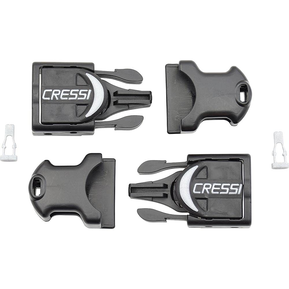 Genuine Cressi buckles fins replacement for Cressi scuba diving fins: Rondine - Reaction - Frog Plus. Each buckle consists of a male & female assembly. Corrosion proof plastic design. Easy to install on fin & strap. Sold by pair.Rubber strap not included.The buckles are made in Italy by Cressi, an Italian brand pioneer in scuba diving, snorkeling and swimming equipment since 1946. The product is covered by a 2-year limited warranty