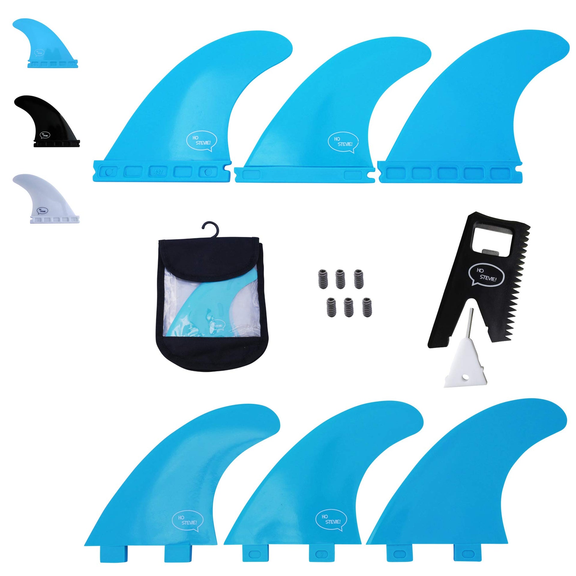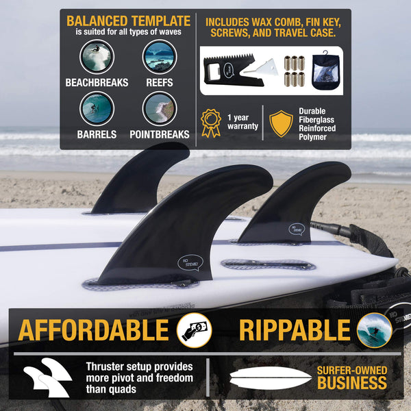 *** Each set of thruster fins comes with premium travel case, fin screws, and wax comb / fin key /bottle opener*** These FRP (Fiberglass Reinforced Polymer) thruster fins are more affordable than our fiberglass honeycomb fins, without much loss in performance. - Lightweight - Responsive - Fast Thruster (3-fin) configuration is great for all-around performance. Loose enough to be fun and playful, but drivey enough to race past the fastest sections (and into barrels if you've got the skills!) We (Ho Stevie!) design all of our products with the highest quality standards. If a fin breaks, we will replace it for free. Join thousands of Ho Stevie! fans, and ride the best surfboard fins. Thruster Fin Specs/Dimensions: G5 Medium Template Base: 109mm (4.3'') Depth: 115mm (4.53'') Sweep: 33 Foil on front fins: 80/20