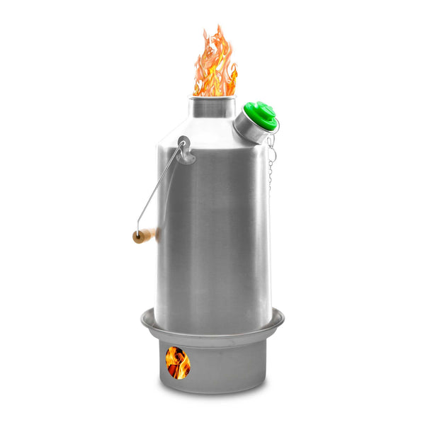 The Kelly Kettle Base Camp stainless steel camp kettle boils approximately 54 oz of water at a time - that? nine 6 oz. mugs of water for camp coffee, tea or hot cocoa. The Kettle will bring water to a boil within a matter of minutes. Suitable for use at your ?ase camp car camping, scout camps, picnics, hunting, outfitters outposts. The kettles are ideal for emergency preparedness kits, humanitarian aid stations, or anyone working in the forests or the great outdoors. Fire base and drawstring carrying bag are included with each Kelly Kettle. The durable stainless steel fire base inverts up into the bottom of the kettle to make the unit as compact as possible for transport and storage. The Green Whistle will sound a nice loud whistle to let you know when the water has boiled. Older Kelly Kettles may have an Orange Rubber or Cork Stopper. These MUST ALWAYS be removed before using the kettle. The Kettle must never be boiled with these older stoppers in the spout, but the new camping kettle with whistle can be left in while the water is boiling. All Kelly Kettle products are the best kettle for camping as they work extremely well in all weather conditions. They are a vital piece of camping equipment for any outdoor adventure. Extremely dependable as they have no moving parts to fail or break. Never pack fuel again and save money. The Kelly Kettles are cost free to run and eco-friendly as they use all natural fuel such as twigs, dry grass, heather, birch bark, pine cones, dry animal dung, etc. such as sticks, twigs. Add the Kelly Kettle Pot Support and Cook Set to your gear and prepare small amounts of food like noodles, rice, oatmeal, eggs, and hydrate food over the kettle while your water boils. Boil water and cook food at the same time using only a handful of fuel! Better yet, grab a Kelly Kettle Hobo Stove accessory and turn the fire base of your kettle into a stand-alone wood fueled camping stove.