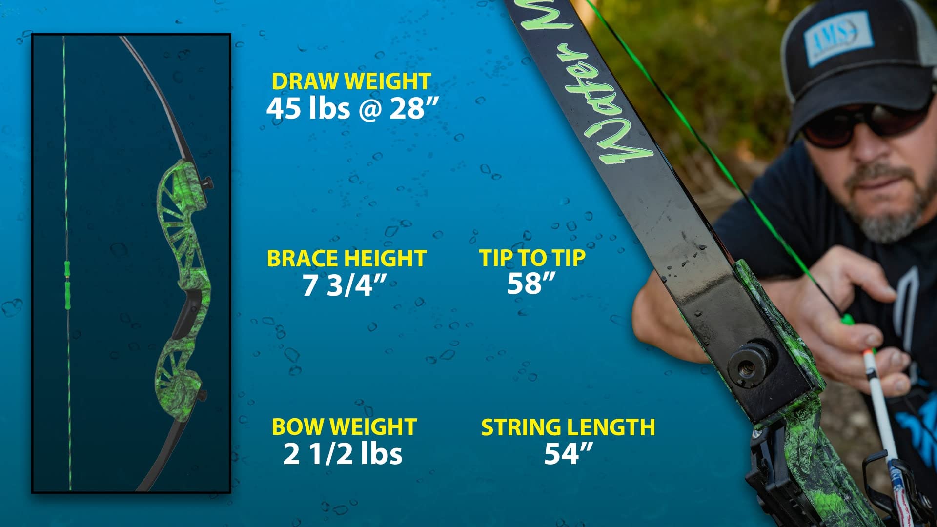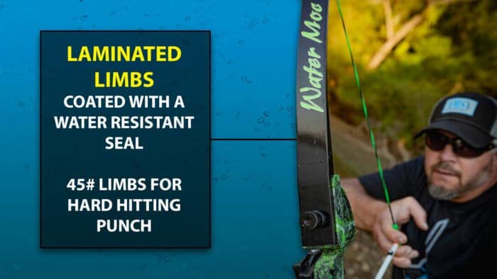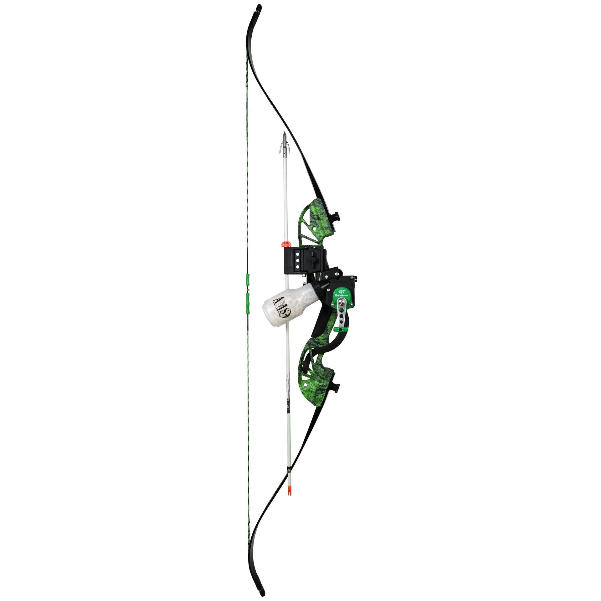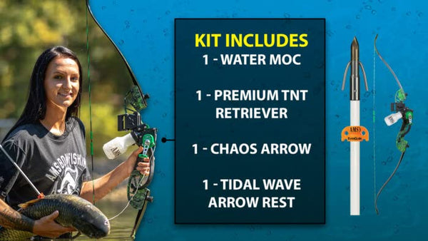 Go retro with this sleek and simple takedown recurve kit. The Water Moc was made for life on the water! It has a sleek black, water resistant seal over fully laminated limbs to ensure long life in wet environments. Sleek, stylish and lightweight, this kit features an AMS designed magnesium riser with AMS exclusive, green koi accents and the AMS stamp of approval! Kit Includes: - Water Moc takedown recurve bow - TNT Retriever reel filled with 35 yards of 350 lb Spectra line - Green infused fiberglass arrow with Chaos FX point/Cyclone tip - Tidal Wave arrow rest - String Things finger tabs (installed)