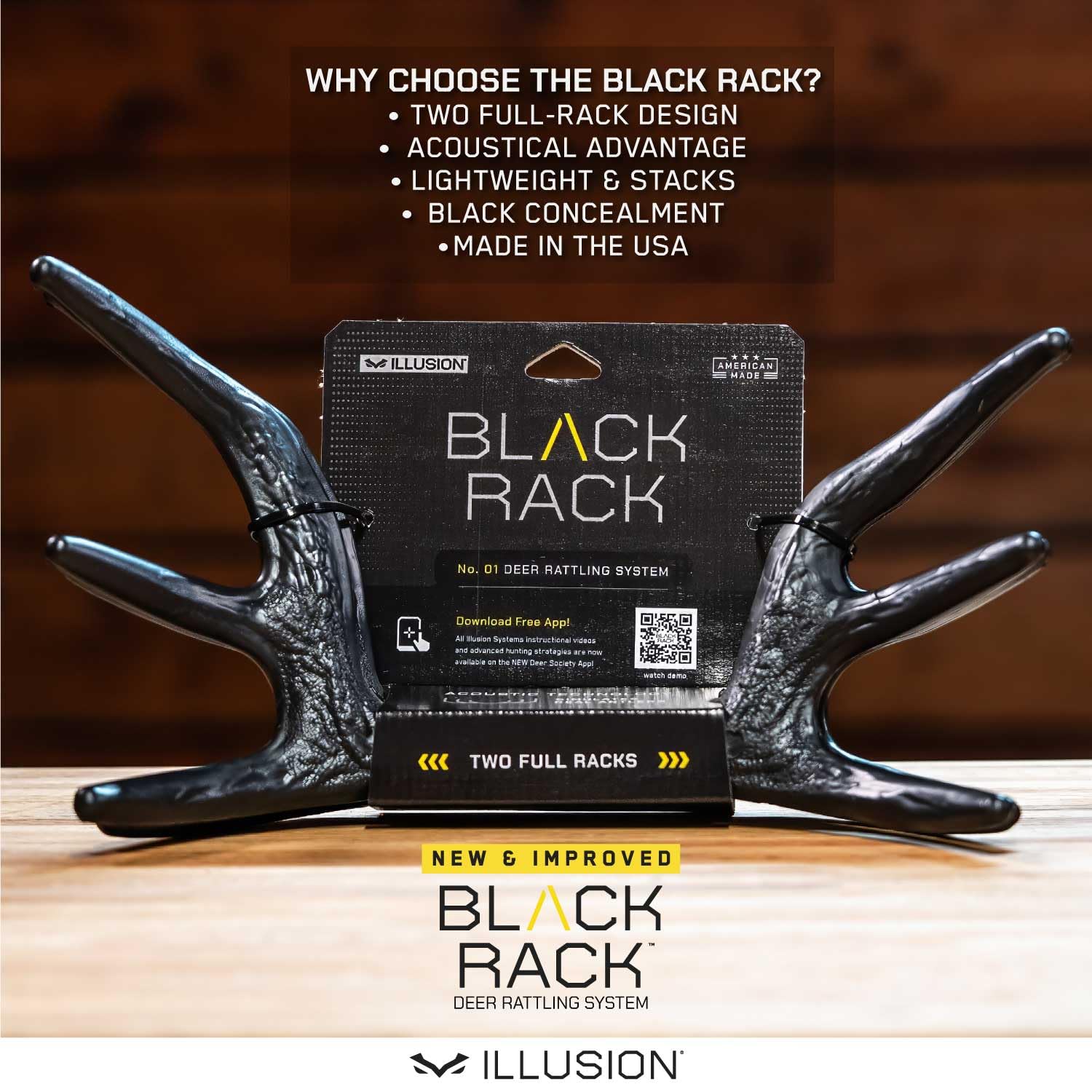 Rattle a trophy buck into range with this! Better than the real thing! The Illusion Black Rack Deer Rattling System features two Full Racks, exclusive Bone-Core Technology and innovative Black Concealment color, all of which make this System more effective than other methods, including using real shed antlers. Amazingly authentic sounds! Plus, you won't bust up your hands while using these, which every hunter can appreciate. Includes 2 Full Racks; Exclusive Bone-Core technology sounds exactly like two bucks fighting it out; Black Concealment color; Also includes in-depth instructional DVD, ''Secrets to Rattling in Trophy Bucks,'' featuring Olympic Gold Medal archer Rod White; Measures approx.