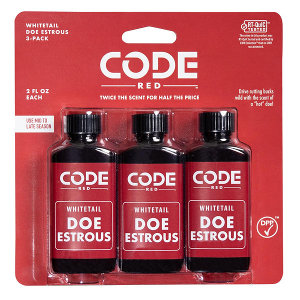 Collected and blended fresh, Code Red Doe Estrous is an all-natural way to increase your odds in the field during mid-to-late season! Lure in those bucks who are hot on the trail by using it in scrapes or on wicks and drags near your hunting site.