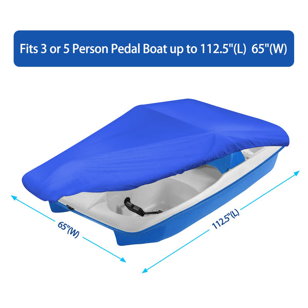 Made of 210 Denier Marine grade waterproof, tear resistant, UV resistant Reflective Polyester, all weather protection, easy clean Heavy duty elastic cord sewn in around hemline for secure and snug fit Designed to fit 3 or 5 person pedal boat, for mooring use, not for trailering, protects against Sun, Rain, Snow, dirt Free storage bag included
