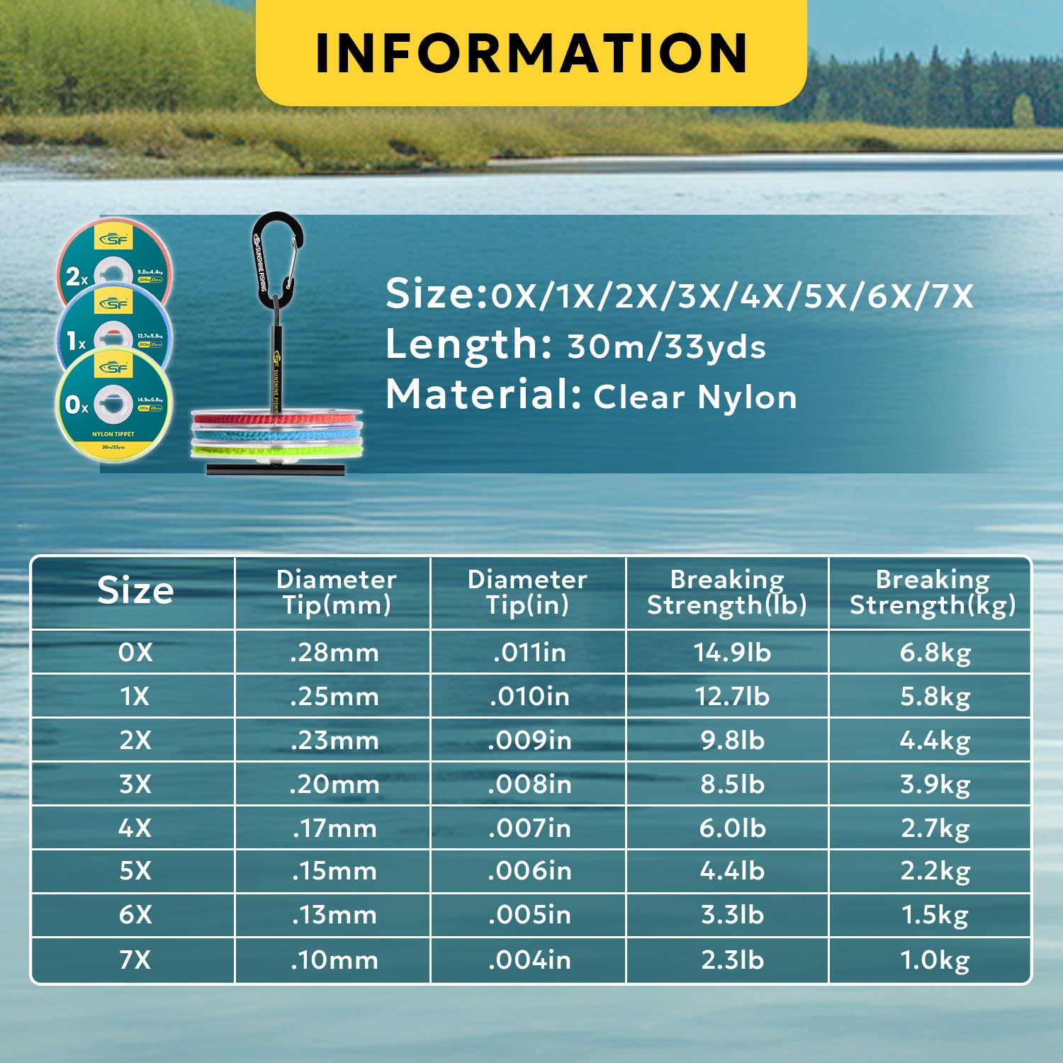 SF Clear Monofilament Nylon Tippet Line Fly Fishing with Spool Holder Tippets Leaders Trout 75M 100M 0X 1X 2X 3X 4X 5X 6X 7X Feature: Length: 75M/82Yds and 100M/110Yds, 2 different sizes to choose. Strong and durable, fits nicely in any setup you have. Material: made of clear nylon, fishing tippet line high strength and light weight, is easy to replace. A perfectly-balanced blend of elasticity, knot strength, and suppleness. Size: 0X 1X 2X: 75M/82Yds 3X-7X: 100M/110Yds
