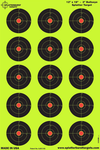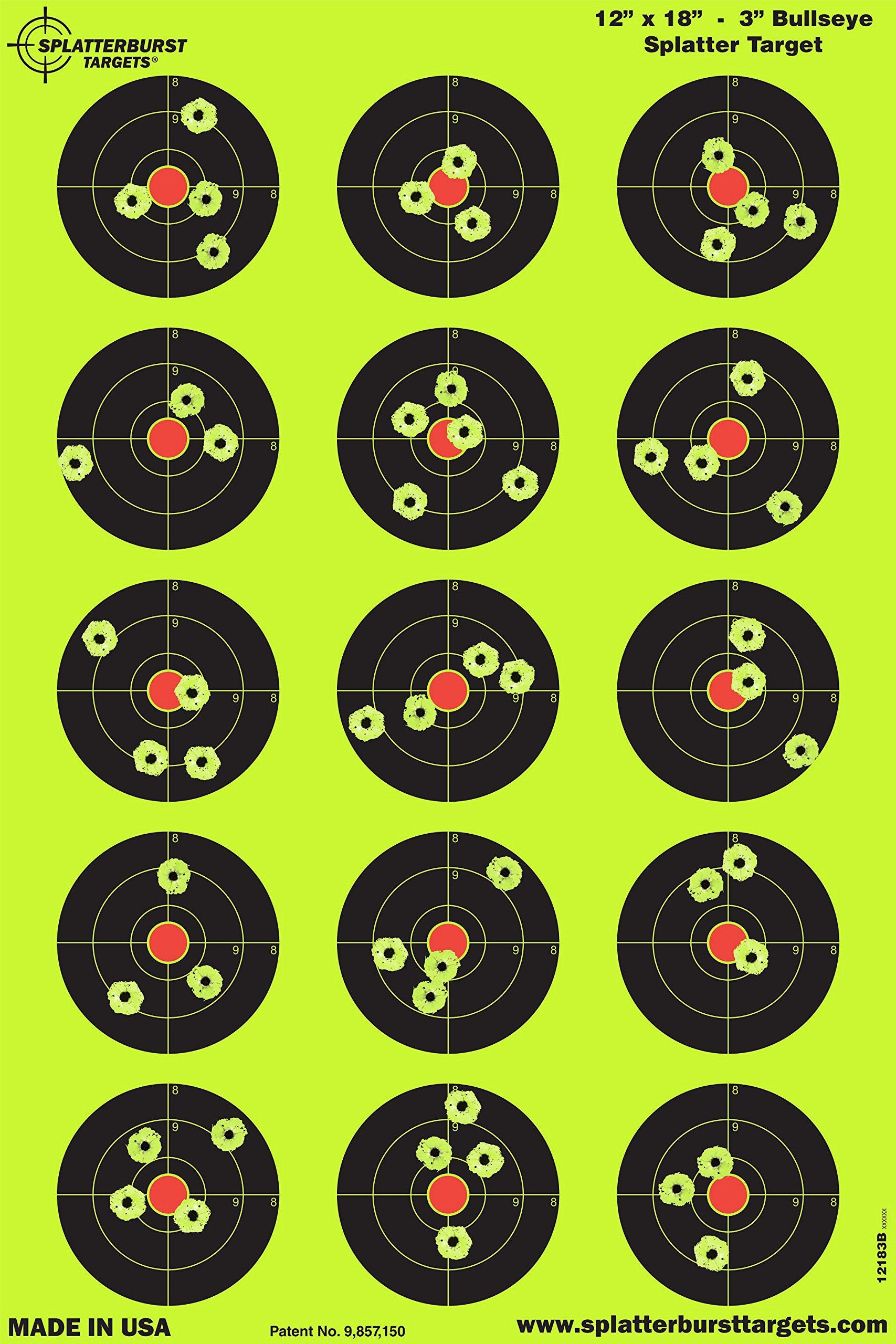 Instantly see your SHOTS BURST BRIGHT FLUORESCENT YELLOW upon impact, spend more time shooting and less time checking your target. Improve your aim with (15) - 3'' targets to shoot at. | The BRIGHT yellow bullet holes are visible in all light conditions, great for people with reduced vision. The heavy duty non-adhesive tagboard withstands shot after shot. | Our HIGH VISIBILITY splatter targets make it EASY to see your shots at a distance, no more wasting time walking downrange to SEE YOUR SHOTS. | The ULTIMATE TARGET for all firearms and calibers, including; Airsoft, BB guns, pellet guns, air rifles and even shotguns. PERFECT for shooting indoors or outdoors, short range or long range. | So good they're PATENTED - PROUDLY MADE IN USA - 100% SATISFACTION GUARANTEED - Makes a great gift