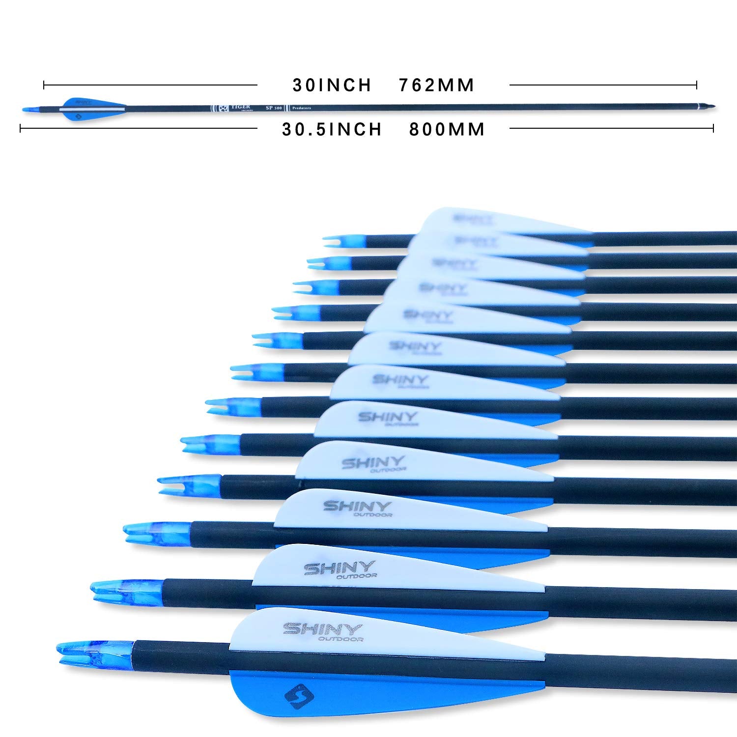 Product Details Material: Carbon Length: 30'' Full Length:31.5'' Spine: 500 GPI: 13.0 grain Shaft diameter: Outer 7.85mm Inner 6.2mm Weight: About 34g each Condition: New item Features: aluminum seat convertible with a variety of inch thread arrow Suitable for Compound bow 35-60pounds Package includes 12 pieces of carbon arrows. 6 Nock for free.