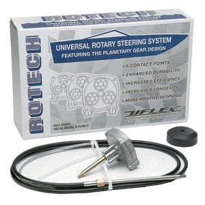 Featuring the T71FC helm with a Planetary Gear Design, the Rotech reduces steering effort and delivers more balanced loads on the steering wheel. This unique design also offers a wider wear area which reduces lost motion and improves durability. Centered on the main drive shaft, this helm requires less room behind the dash and is a direct ''drop in'' replacement for competing system; requiring no new holes for installation. The Rotech package also includes the M66 Universal Rotary Steering Cable with stainless steel output fittings for maximum longevity and smooth steering. Kit includes: T71FC - helm, X34 - 90 degree bezel, M66 - steering cable