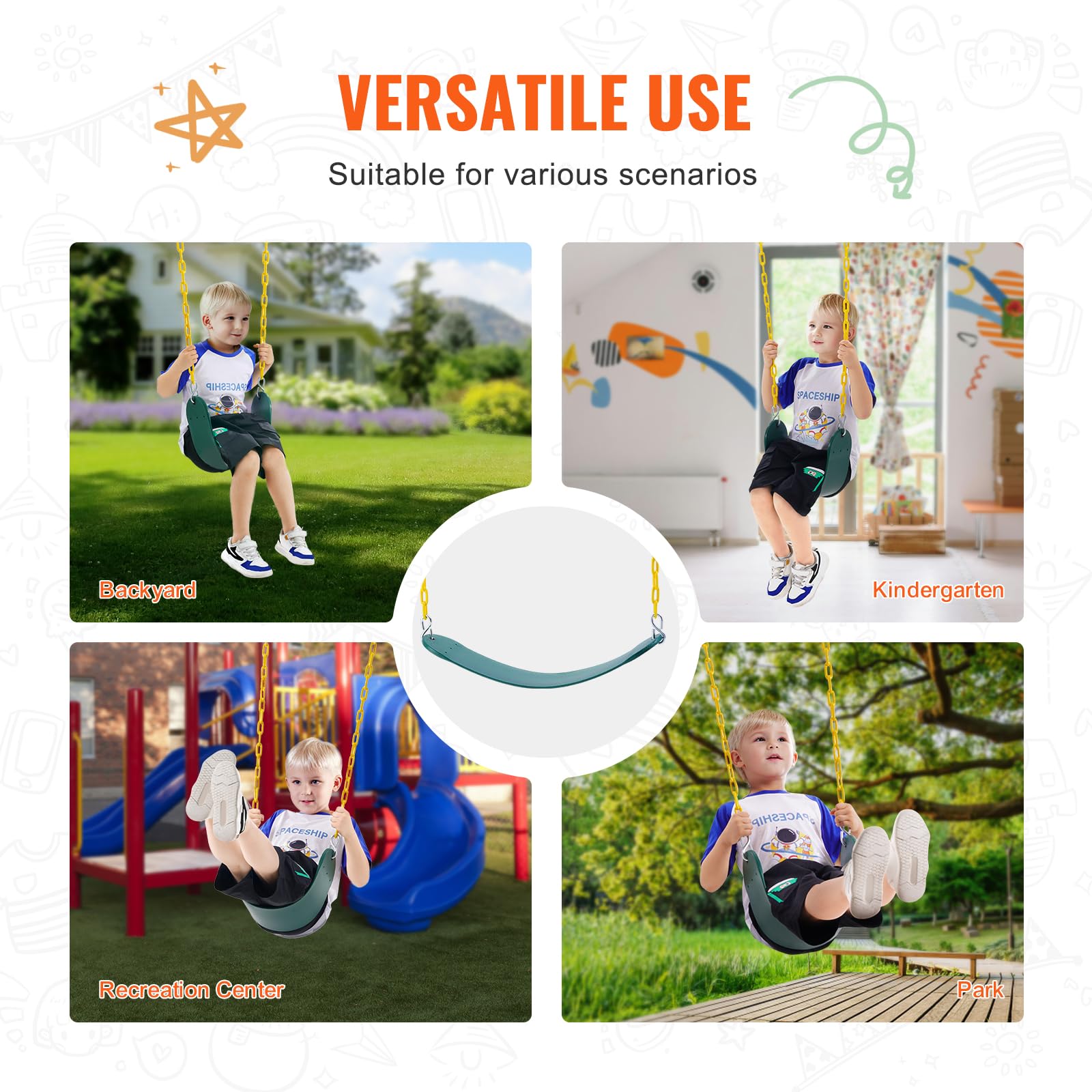 300 lbs High Load Capacity: The VEVOR 2-piece heavy duty soft board baby swing seats support a maximum weight of 300 lbs (136 kg), accommodating older children for extended use. It includes heavy-duty chains, non-slip seats, and snap hooks to ensure safe play. | Suitable for 36 Months+ Children: Ideal for toddlers, children, or teenagers aged 36 months and older, this porch swing is a perfect addition to any child's playhouse! Widely used in backyards, playgrounds, trees, swing sets, and more, it encourages children to spend more time outdoors and enjoy a happy childhood, making it an excellent gift for kids. | Durable and Reliable: The seats of the swing sets for backyard is made from durable EVA, designed to withstand outdoor conditions and provide hours of safe fun. The iron chain is coated with yellow plastic for a soft, pinch-free grip, paired with galvanized steel snap hooks and a stable triangular structure, ensuring ultimate comfort and safety during play. | Safety Certified: Our swing set is CE/CPC certified for your peace of mind. Safety is our top priority when children are playing. There is no need to worry about the quality. | Ideal Gift: This 2-piece baby swings for infants are perfect for any child's playhouse! Widely used in backyards, playgrounds, trees, swing sets, and more, it encourages children to spend more time outdoors and enjoy a happy childhood, making it an excellent gift for kids.