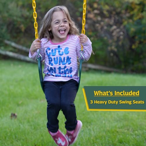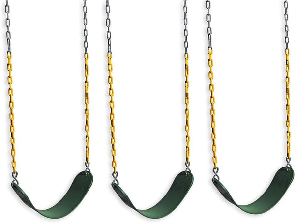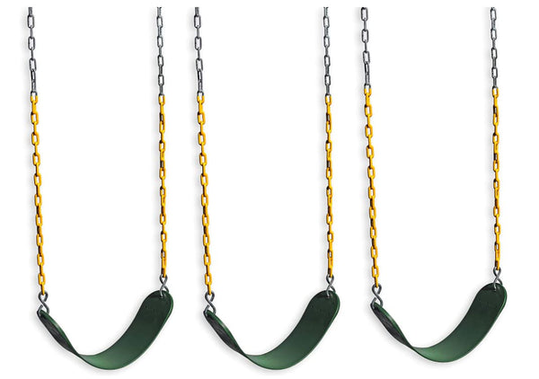 Great for children of all ages - this bundle is the perfect addition to your outdoor backyard swing set. Three of our most popular outdoor swings, the heavy duty belt swings, are now bundled together in a set of three - and offered at a discounted price! All three swings come fully assembled and feature safe, plastic coated swing chains that are soft to grip and pinch-free. Complete your backyard fun center with the addition of these three, high-quality, heavy-duty swings from Eastern Jungle Gym.