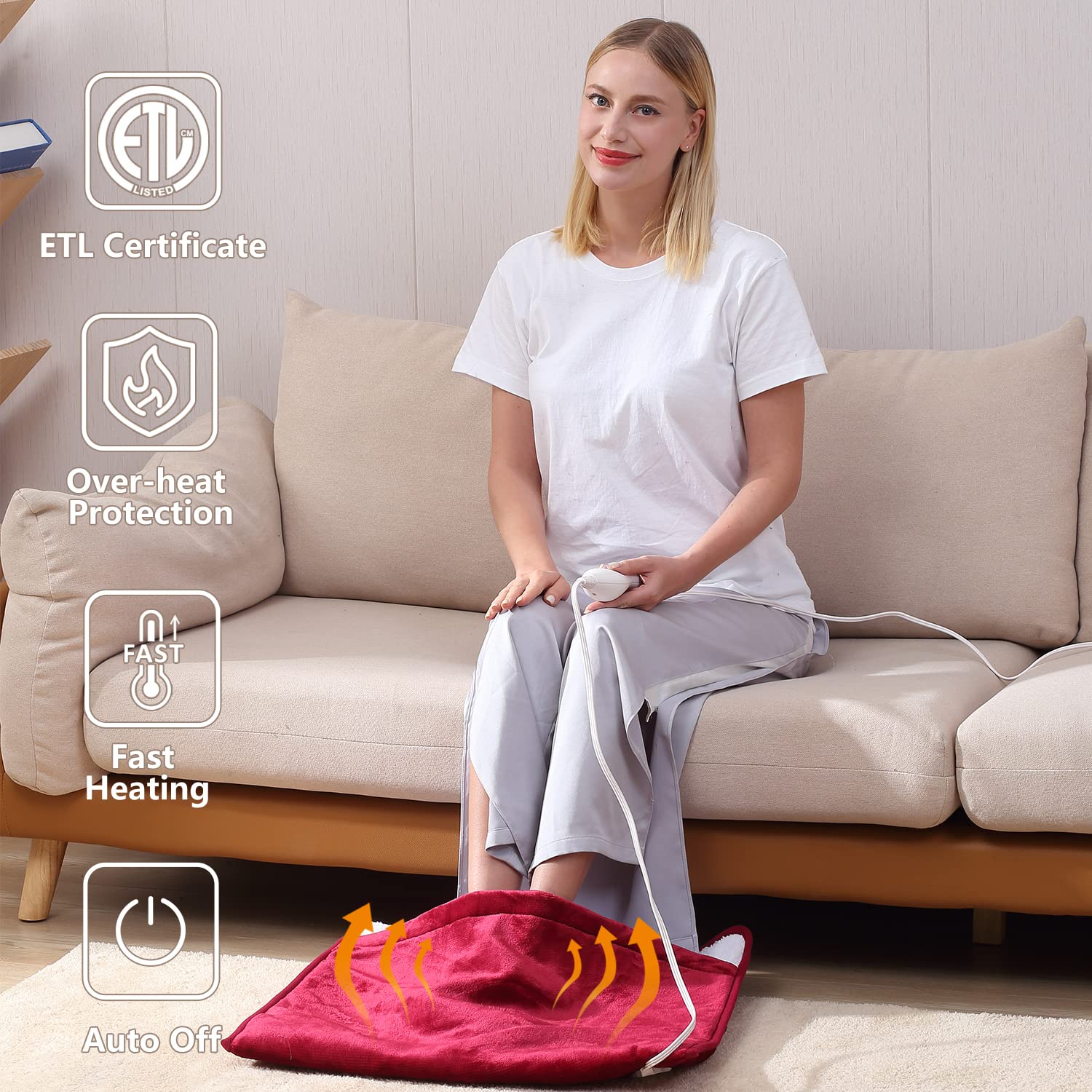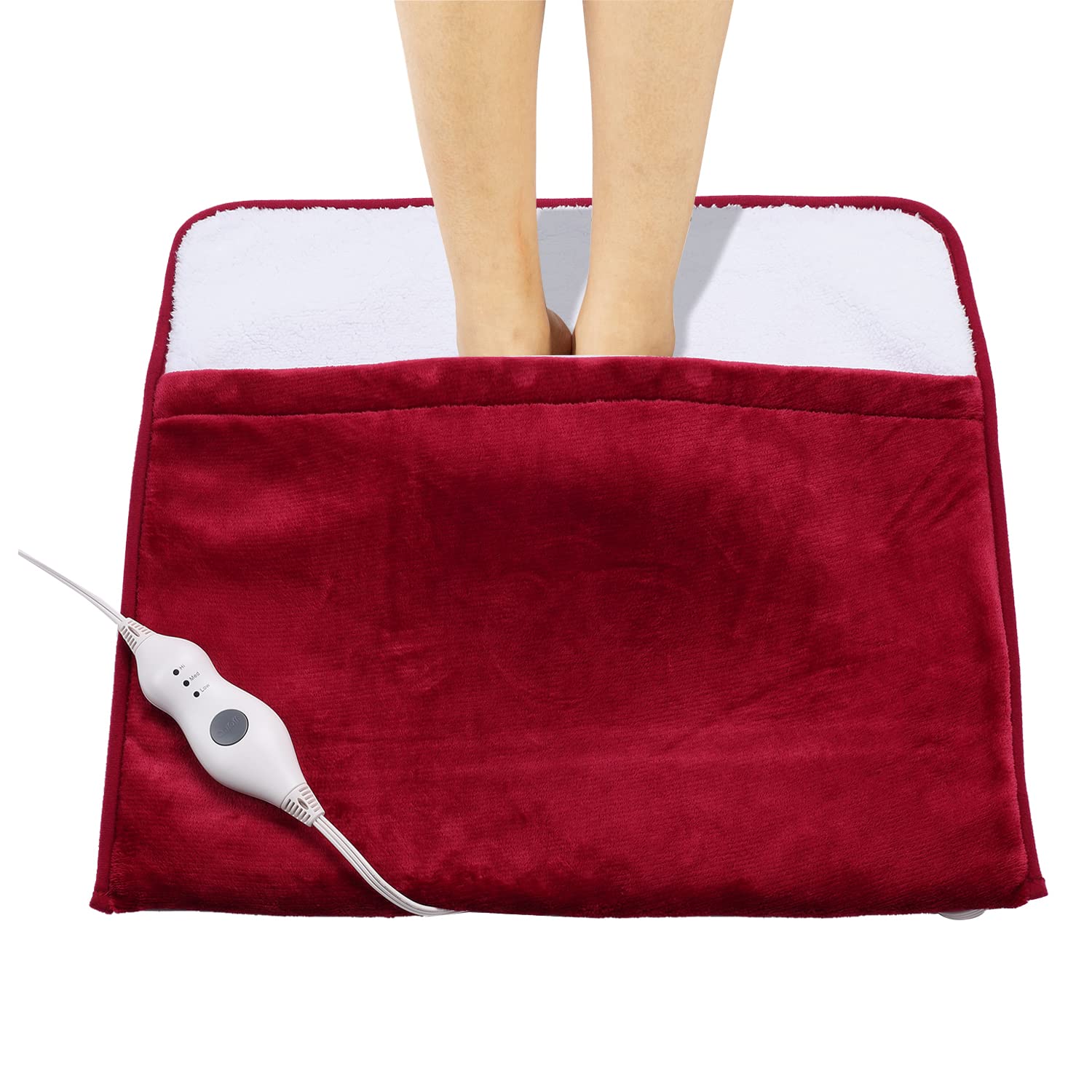 Popular science time Foot is the second heart of a human body. Foot is the root of human body and the key to health. Half of the twelve meridians connecting the body and viscera stop at the foot. There are more than 60 acupoint on the foot, so foot are known as ''the second heart'' of the human body. If your foot are warm ten your whole body don't feel cold. It takes only several minutes to heat, so you can keep your foot warm in no time. This electric foot warmer is safe . Energy saving, environmental protection and super power saving. Warm your whole body. Easy to carry.Enjoy warmth everywhere. Product SpecificationsMaterial:Flannel Heat Settings:3 Size: 22''x 20'' Cord: 9ft Power Supply: AC 120V, 60Hz, 95W, 0.8A Using Time: 120 Mins Automatic Shut-off
