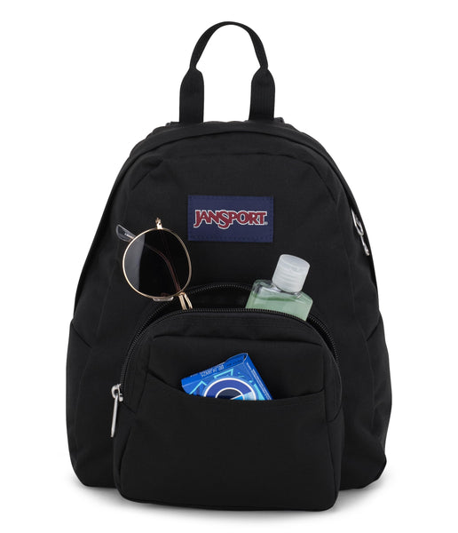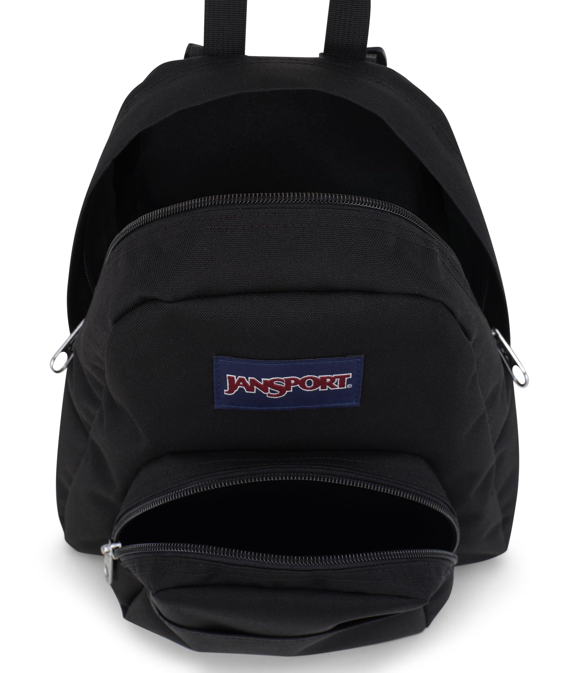Always be ready for everyday adventures with the Half Pint Mini JanSport Backpack for men, women and kids! This small black backpack combines style, convenience and functionality so that you can always carry your essentials with you in a lightweight backpack purse. This miniature JanSport backpack for boys and girls is designed to be durable, high-quality and ready for anything! This black JanSport backpack for women and men is made with incredibly durable, 100% recycled 600-Denier polyester fabric to ensure it lasts through everyday adventures, with sturdy zippers and a strong web haul handle for convenient grab-and-go commuting. This mini backpack for girls and boys has one large main compartment to keep your larger essentials like sunscreen, a wallet, and a phone organized, and a zippered small front stash pocket for smaller items. Plus, our small backpack for men and adults has adjustable shoulder straps for all-day comfort, whether youre headed to a theme park or the store! Product Details: (1) Half Pint Mini Backpack Materials: 100% Recycled Polyester 600-Denier Fabric Size: 11 x 10 x 4 inches Capacity: 10.2 L