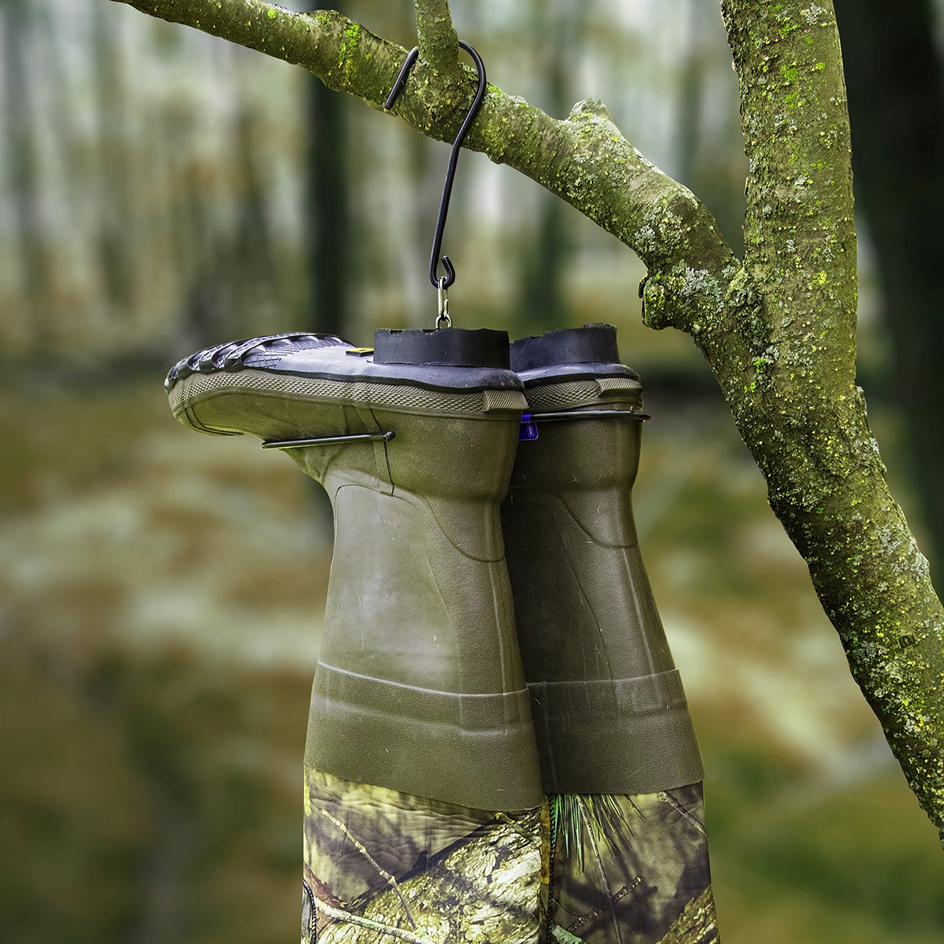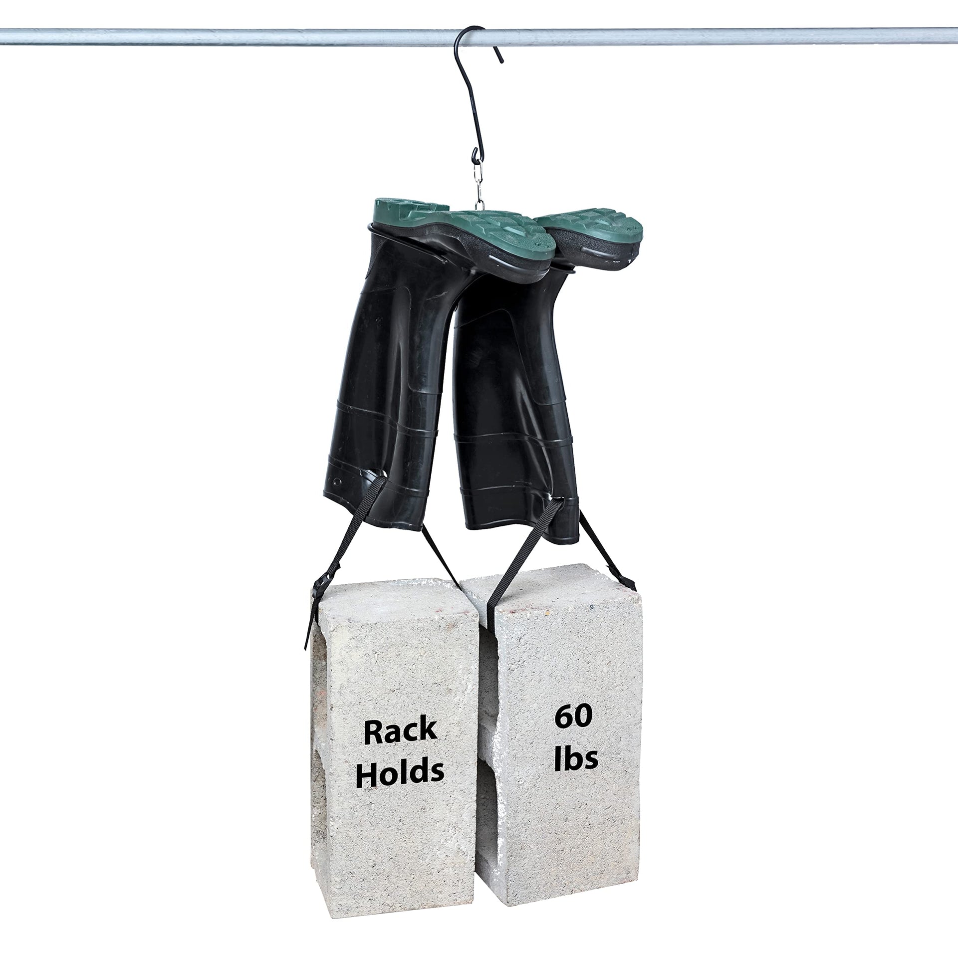 The Snake Wader hanger will hold 1 pair of waders, boots, high top sneakers, or any shoe with a boot like or higher upper. Hang waders and boots anywhere in closet, from curtain rod, tree branch or over door. Reduces odor and grime by holding footwear open and off the ground which allows air to circulate around footgear. Waders last longer by keeping their natural shape during drying and storage. The plastic coating on this wader storage hook is like the coating on your dishwasher so hanger will not rust or stain your boots. Built tough steel with polymer coating to hold 60 pounds for years of service. Weighs only 6 ounces with a flexible chain for flat, easy travel pack. Size: 6''L x 10''W x 10.5''H (1/4''H folded flat) Color: Black