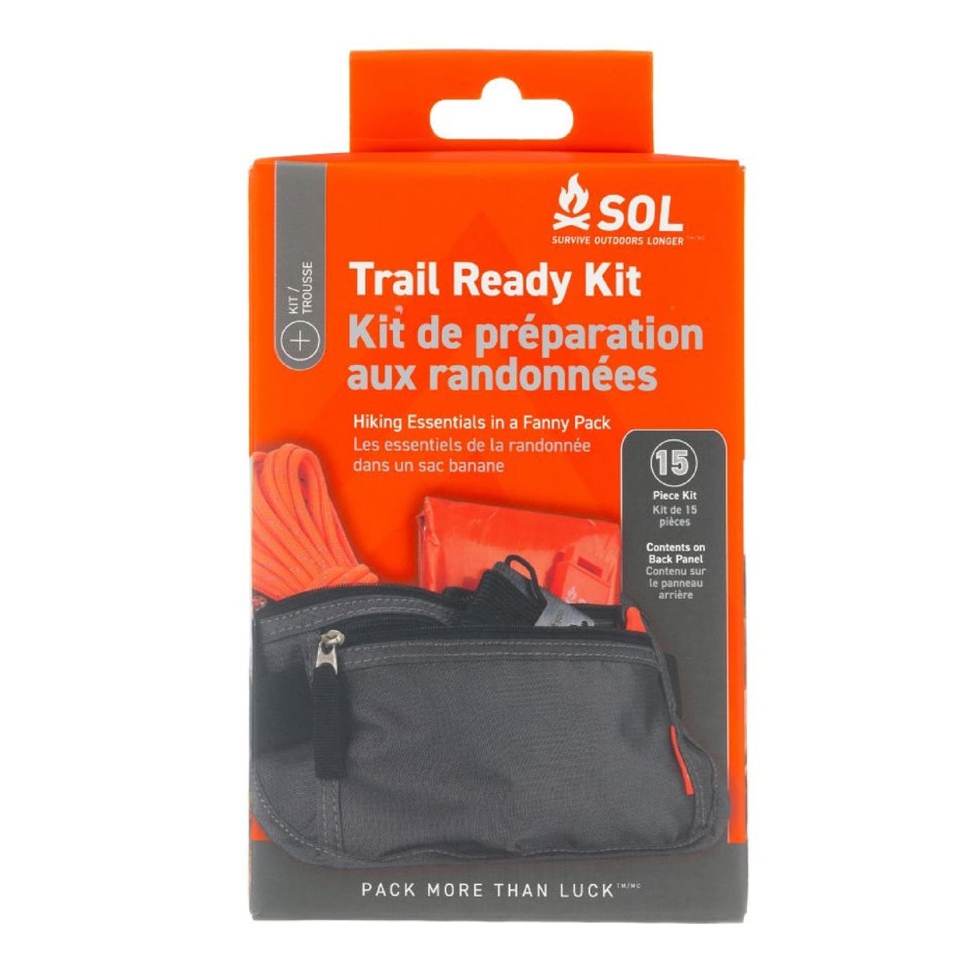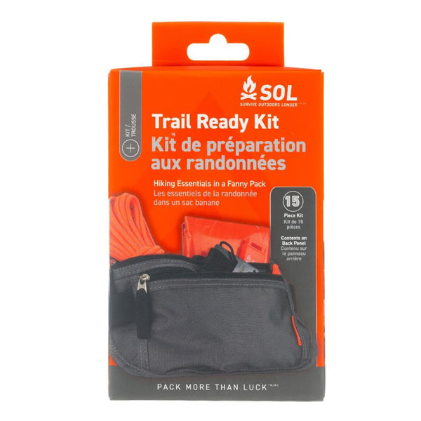 Gear up for your next hiking adventure with the SOL Trail Ready Kit. Packed with 15 survival essentials, you can hit the trail with confidence. A padded fanny pack with an adjustable waistband and 2 zipped pockets store all your gear. Wrap the reflective blanket around you to reflect your bodys thermal heat to keep you warm. Start a fire with the Tinder Quik and MicroSparker or use the Tinder Cord to light your stove. Alternatively, use the Tinder Cord and reflective blanket to string up a shelter. Dry and clean off with the SOL Tight Pak Towel. Signal for help with the Slim Rescue Whistle and Reflective Mirror. Fix gear and gather food with the fishing-sewing kit and survival tool. Patch any holes with the mini duct tape roll. Navigate to safety with the liquid-filled compass. Safely explore new trails and old favorites with the SOL Trail Ready Kit.