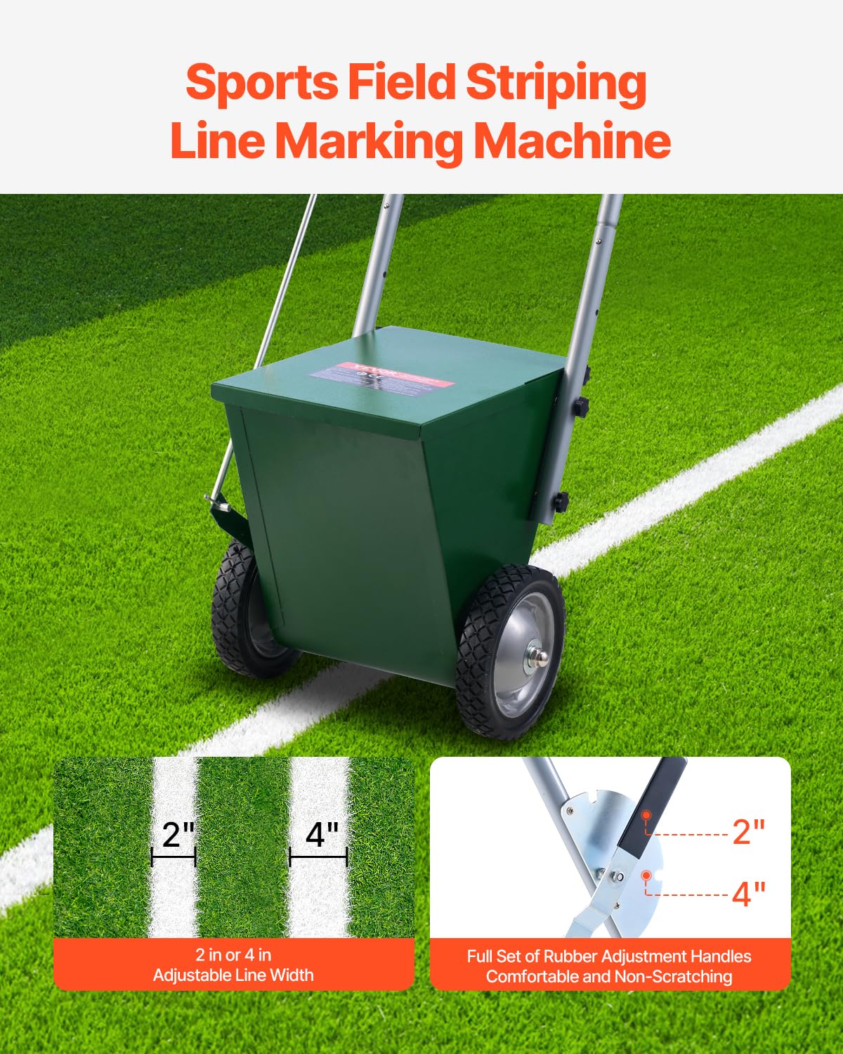 7-Inch Heavy-Duty Metal Wheels: This dry line marker is equipped with durable metal wheels, providing excellent wear resistance and load-bearing capacity. It maintains stability on rough or uneven surfaces, ensuring a smooth line marking process. The wheels are designed to minimize vibrations during movement, improving operational accuracy and reducing deformation or damage under heavy use | 25 lbs Capacity: This field chalker has a 25 lbs material capacity. With a 2-inch line width, it can mark approximately 2520 ft; with a 4-inch line width, it marks about 1260 ft. The top lid helps keep the powder dry | Versatile Application: Ideal for various sports fields such as soccer, baseball, softball, and tennis courts, this heavy duty steel chalker quickly and accurately draws clear lines, ensuring standardized and professional fields for training and competition. It's a great tool for sports venue managers and event organizers | Easy Installation: The package includes clear installation instructions, making the setup and operation incredibly simple. Even beginners can quickly get started and begin using the field dry line chalker with ease | Adjustable Line Width: This field chalker machine provides adjustable line widths of 2 inches and 4 inches, allowing you to easily customize the line thickness to fit different project needs. The axle structure and ABS stirrer ensure even powder distribution, producing clear lines even in humid conditions