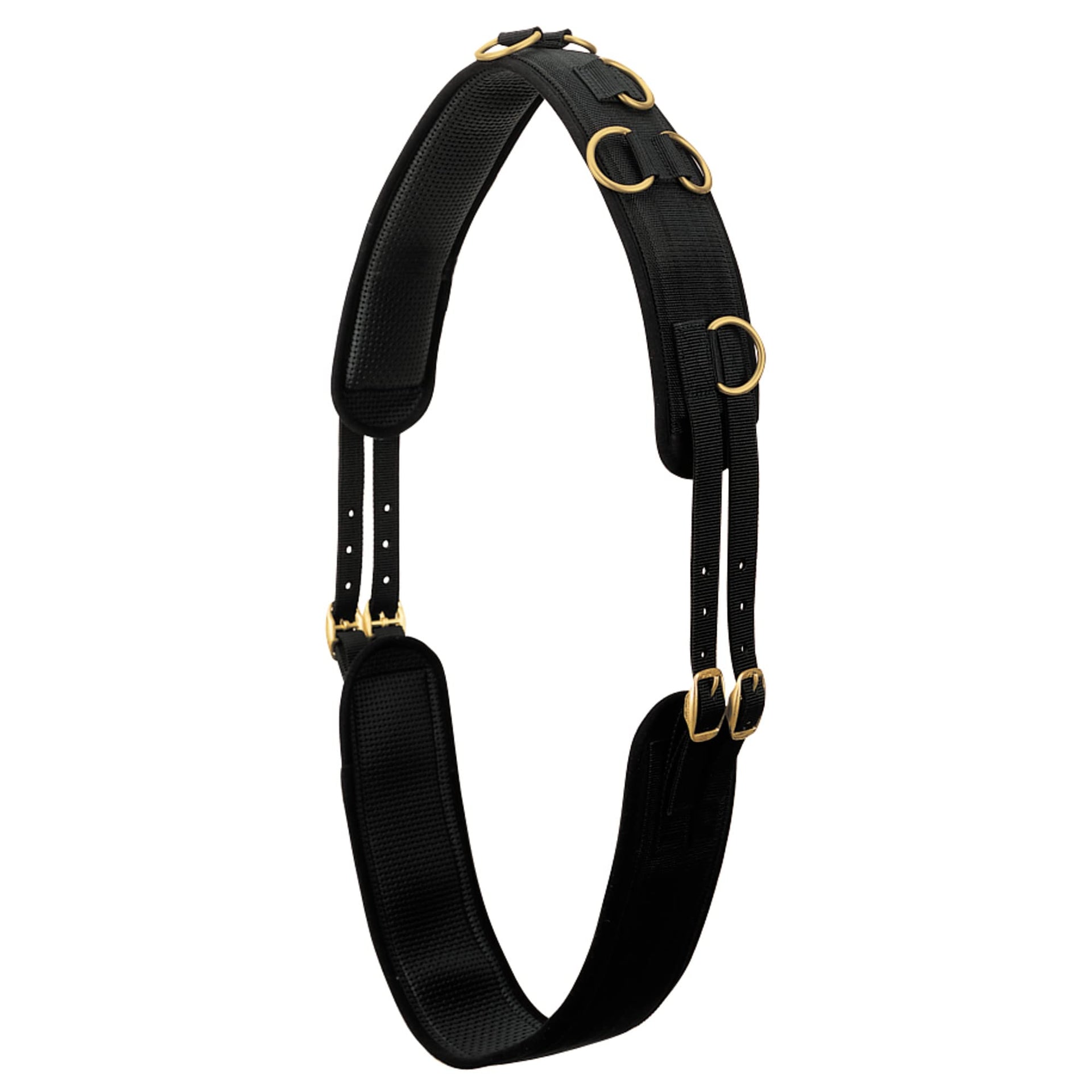 This black webbing and neoprene surcingle features brass plated Dee rings for the attachment of side reins and training aids. The neoprene is shock-absorbing, easy-to-clean, withstands the elements and moves with your horse. This surcingle adjusts at both sides with brass plated buckles.