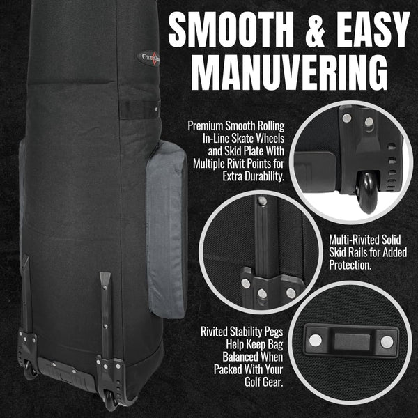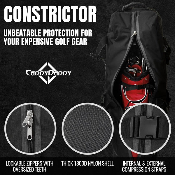 The Constrictor II Travel Cover features: 1800d fabric, easy rolling in-line skate wheels, heavy duty curb rails and 2 large shoe pockets for extra gear. The top of the bag is heavily padded to help protect club heads and the internal and external compression straps to keep clubs secure during travel.