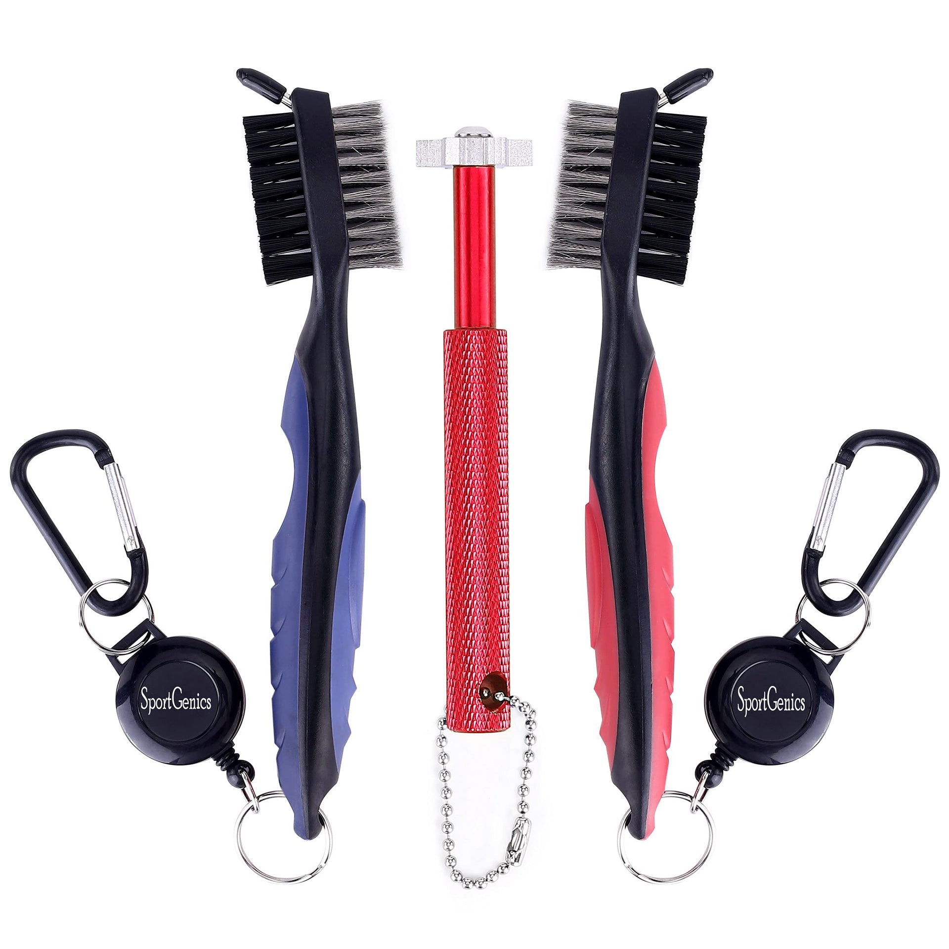 A COMPLETE Golf Accessories BY SPORTSGENICS: The SportsGenics package includes golf club brush (pack of 2) with retractable zip line tool carabiner and 1 golf club groove sharpener. This set could be a great addition to your golf bag accessories. IDEAL SIZES: Golf Brush perfectly size at 19CM length groove sharpener golf size 12*2.3CM