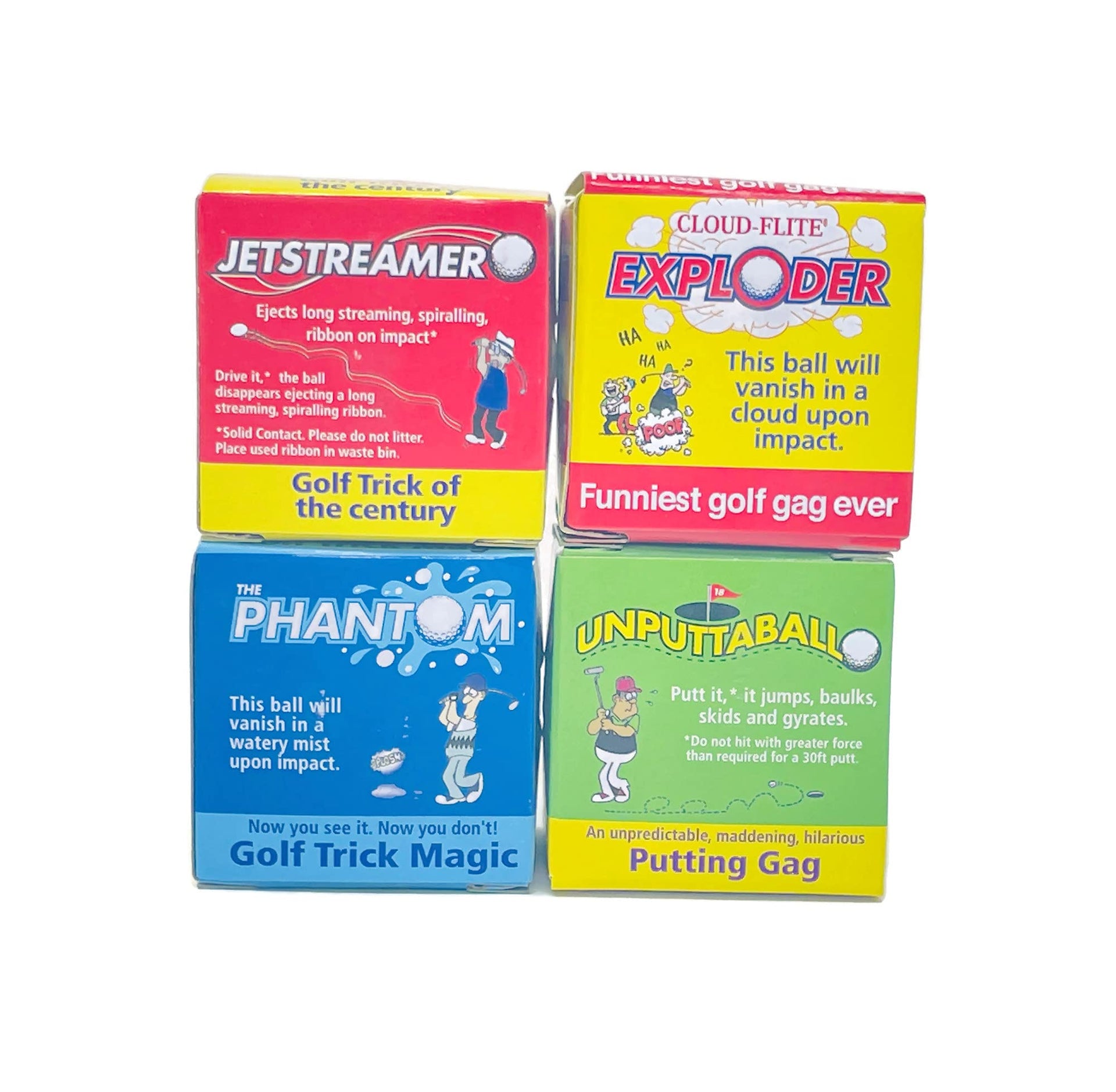 8 Joke Golf Balls you will receive the following: 4 - Exploding Golf Balls. These balls vanish in a cloud upon impact. 2 - Unputtaball Golf Balls. Putt it and ball jumps, baulks, skids and gyrates. 1 - Phantom Golf Ball. This ball will vanish in a watery mist upon impact. 1 - Jet Streamer Golf Ball. This ball ejects a long streaming, spiralling ribbon on impact. Have lots of fun this summer on the course.