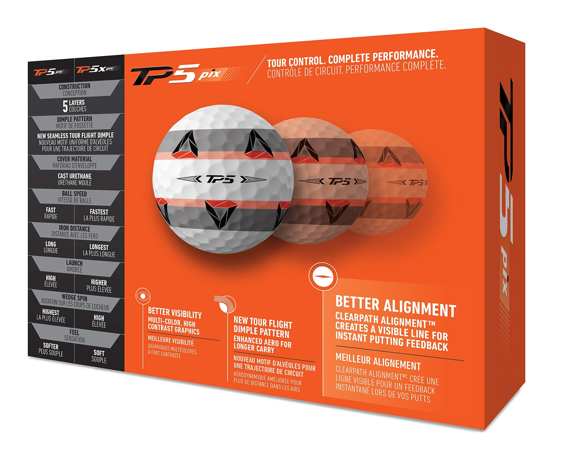 TP5 Pix combines TOUR-proven 5-layer technology with an easy-to-see design. Multi-color graphics enhance visibility during both low and high light hours and allow golfers to see how much spin is generated around the green.