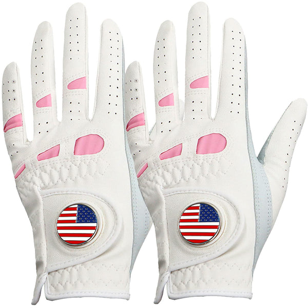 Amy Sport Golf Gloves Women Left Hand With Ball Marker Usa Flag Leather 2 Pack For Right Handed Golfer All Weather Grip Soft Com