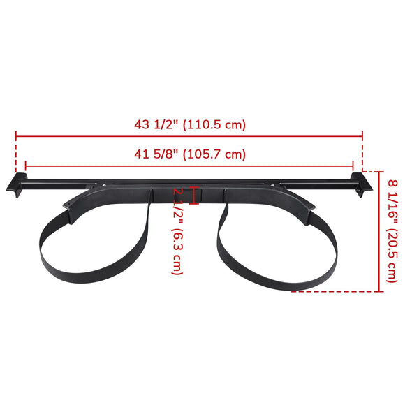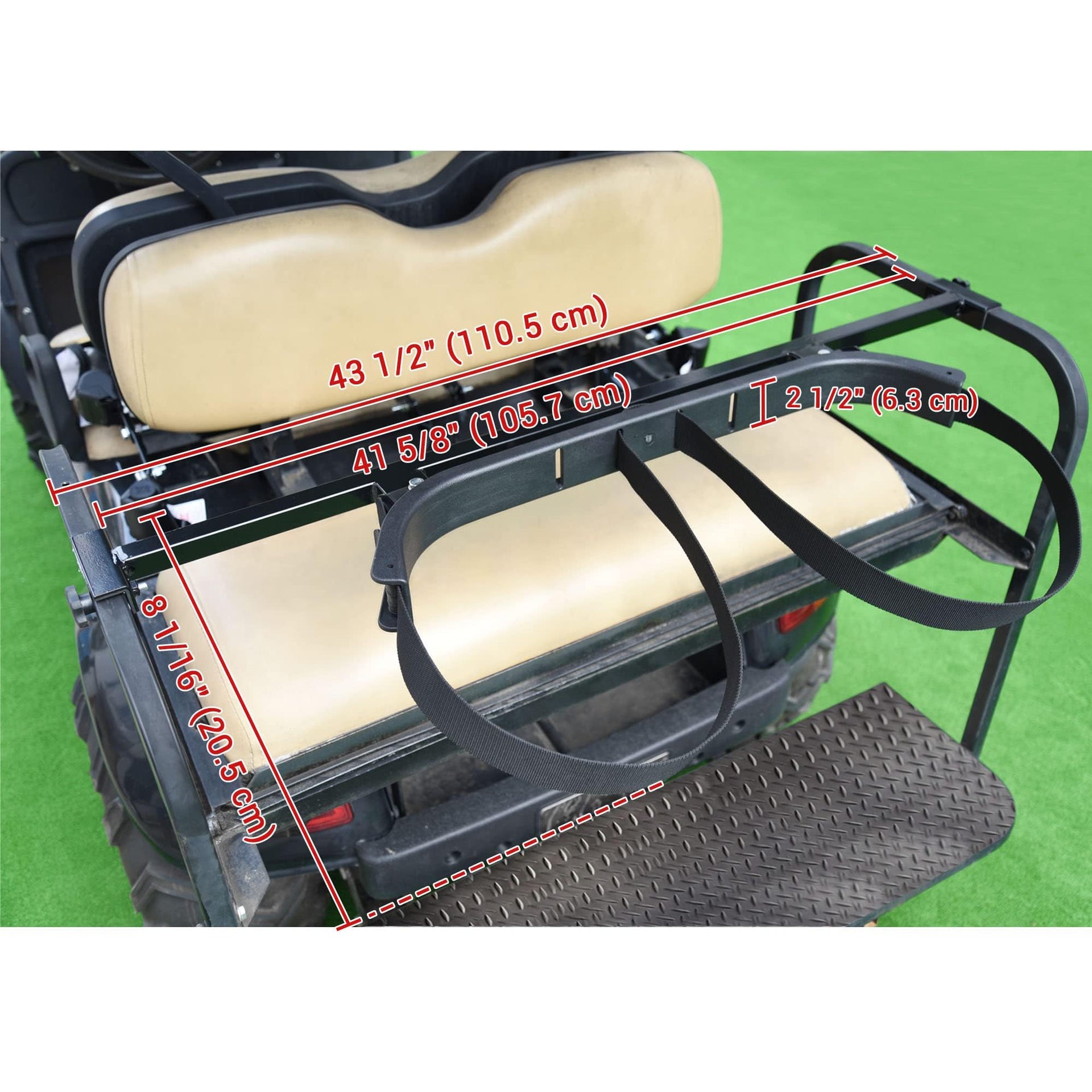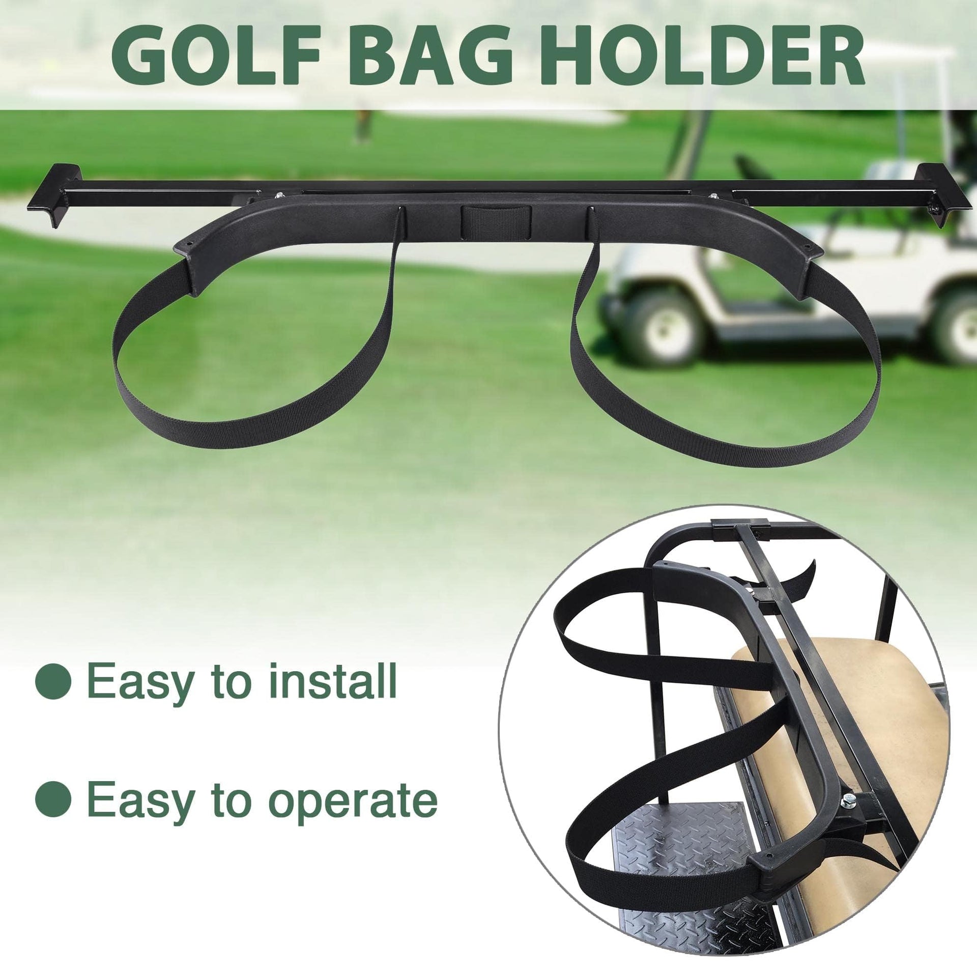 Features:- Universal Golf Bag Holder - Golf Bag Holder Bracket Attachment includes 1 iron bracket, 1 plastic bracket & 1 strap, can hold 2 golf bags; Fits for the rear flip seat, providing an easy & secure way to hold your golf bags; Universal for Club Car, EZGO, Yamaha and any golf cart with 41 5/8 '' long rear seat kit installed- Durability - Sturdy metal frame with wear-resistant nylon fixed webbing & strap for durability, ensuring a long time use- Easy to Install - Secure the plastic bracket to the iron bracket, then install the kit on the rear seat of the golf cart, and use the strap to fix your golf bags; All accessories are included for fast & easy installation- Stable Design - Comes with nylon strap to fix the bottom of golf bags, holding the bags tightly and securely without slipping- Product Size - Overall Dimension(LxWxH): 43 1/2 '' x 8 1/16 '' x 2 1/2 ''; Strap Size(LxW): 75 3/16 '' x 1 13/16 ''Specifications:- Overall Dimension(LxWxH): 43 1/2 '' x 8 1/16 '' x 2 1/2 '' (110.5 x 20.5 x 6.3 cm)- Iron Bracket Thickness: 1 '' (2.5 cm)- Plastic Bracket Length: 27 15/16 '' (71 cm)- Webbing Size(LxW): 75 3/16 '' x 1 13/16 '' (191 x 4.6 cm)- Suitable Installation Length: 41 5/8 '' (105.7 cm)- Net Weight: 5.62 Lbs (2.55 kg)Package Contents:- 1x Iron Bracket- 1x Plastic Bracket- 1x Nylon Strap- 2 Sets of Screws- 1x ManualNotice: - Please note that you may need to drill holes on the hand rails of the back seat of your golf cart if necessary.