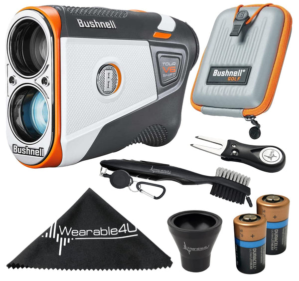 - Q: What is included in the Bushnell Tour V6 Shift Laser Golf Rangefinder package? A: The package includes the Tour V6 Shift Laser Rangefinder, a premium carrying case, a washable micro-fiber cloth, two CR2 batteries, a Wearable4U lens cloth, and the Ultimate Wearable4U 3 Golf tools which consist of a golf brush, divot repair tool, and ball pick-up tool.