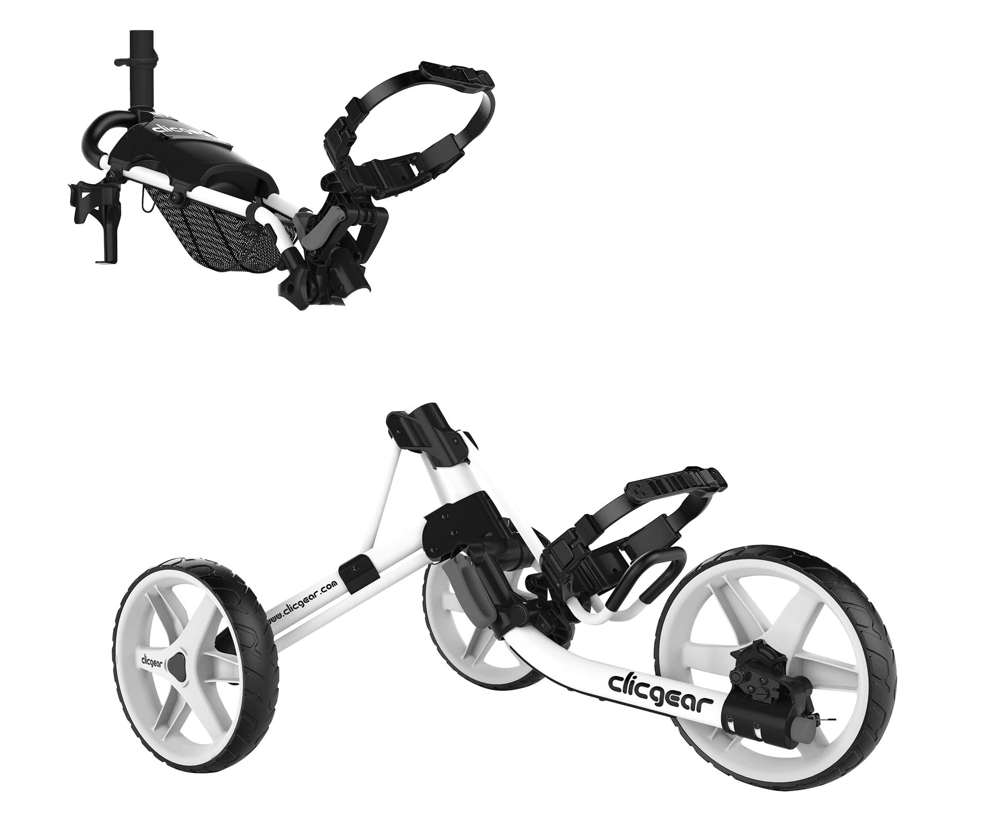 clicgearAs flagship 3-wheel cart has been upgraded and refined in 2020 with the long-awaited release of the Model 4 0 Features: NEW Silicone Bag Strap System NEW Adjustable Upper Saddle NEW Lower Saddle NEW Silicone Umbrella Tube Strap NEW console Lid Lock NEW Silicone Scorecard strap Quickly Folds Down to a compact 13 x 15 x 24 Front-Wheel Engaged Hand Brake Independent Handle Bar Adjustments Large console (scorecard, ball, pencil & tee holders) Large Storage Net Accessory Mounts x4 (standard cup holder included) Umbrella Mount & Bracket Accommodates Most Stand Bags