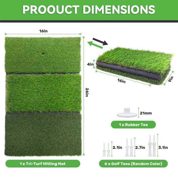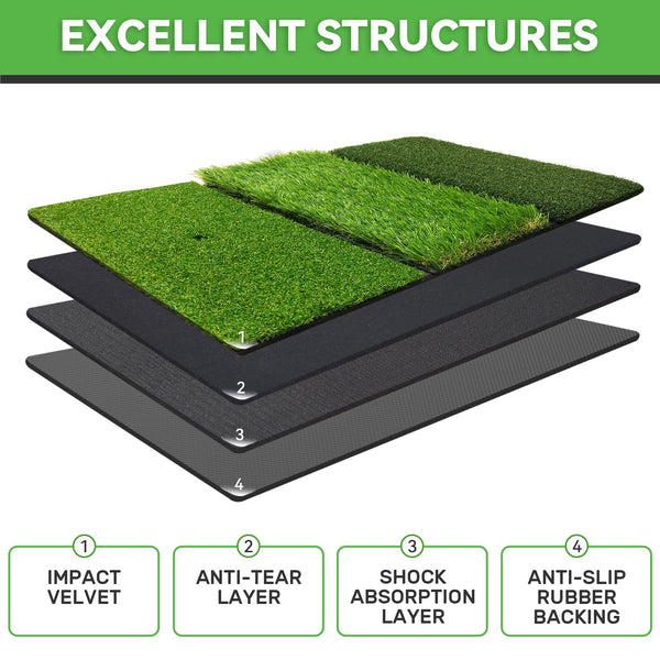 Durable Base Construction - COSPORTIC Golf Training Mat can handle even the toughest swings with shock absorption. Its reinforced construction and maximum grip will keep your mat in place while training. Easy To Use Anywhere - Whether you use our golf hitting mat at home or on the backyard, playground, or any grass, it can provide you and your children with a good practice experience. With golf training mat that shows swing path, you don't need to worry about wear and tear on your floors or turf.Golf Gifts for Men/Women