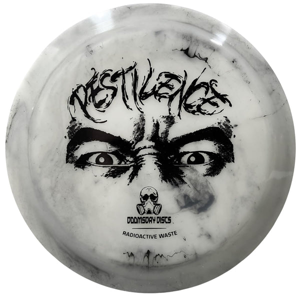 The Pestilence by Doomsday Discs is part of the Catastrophic Line of discs. It is a wide-rim distance driver that is understable (fade resistant) enough to be handled by new players. For experienced players, it is an excellent tool for hyzer-flip and long s-curve shotsor rollers. Reach your maximum potential on long throws without needing maximum arm speed or power. After the world comes crumbling down, youll be able to use the Pestilence well into the dystopian future since it comes in long-lasting, premium, ''Radioactive Waste'' glow-in-the-dark plastic. Stamp and disc colors may vary and weights range from 170-175 grams.