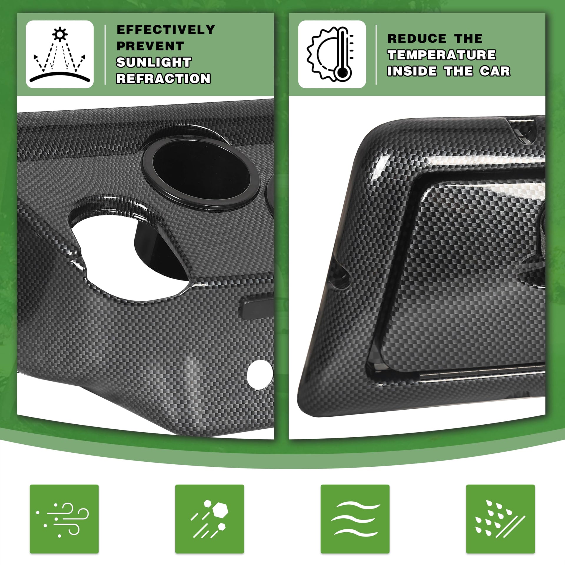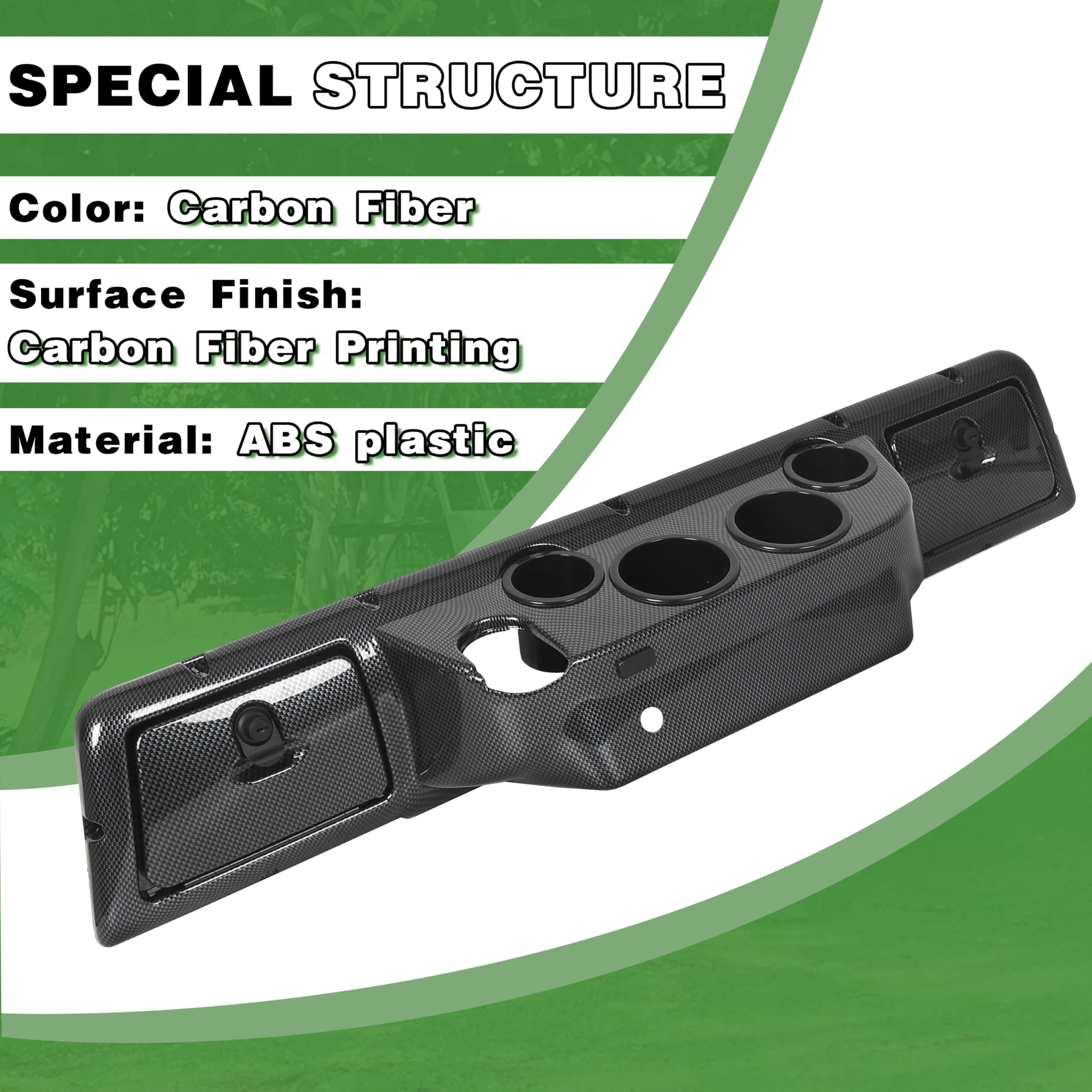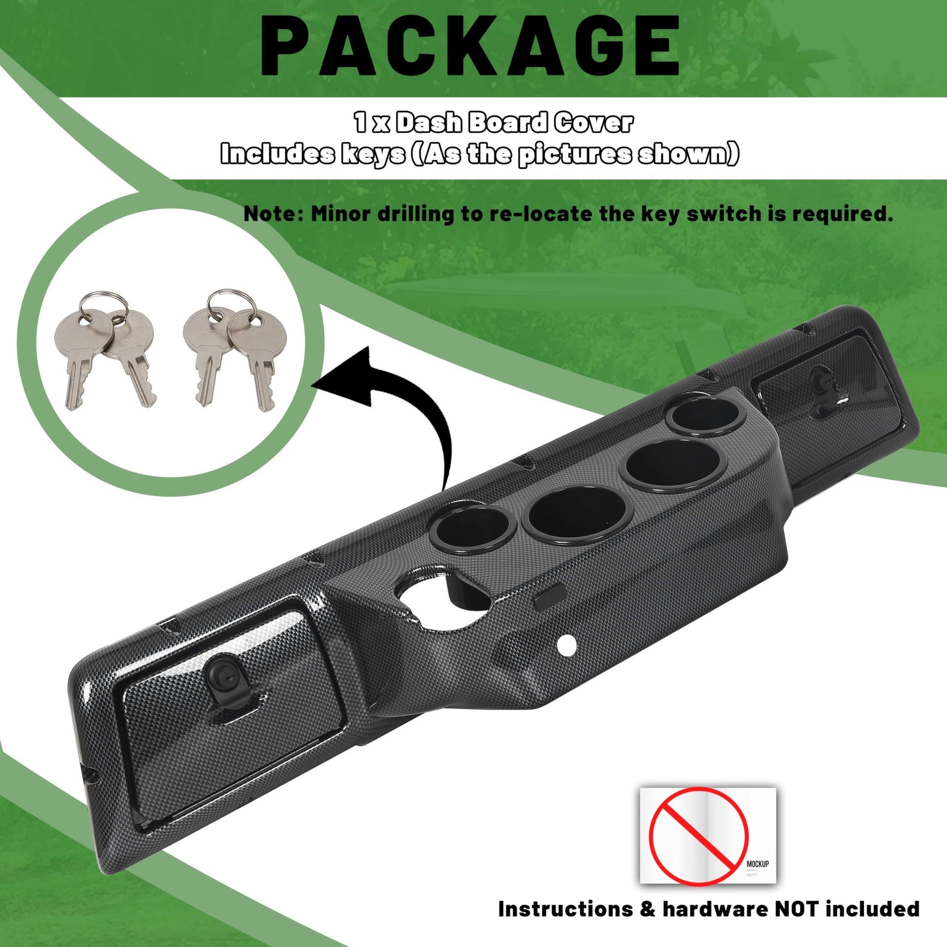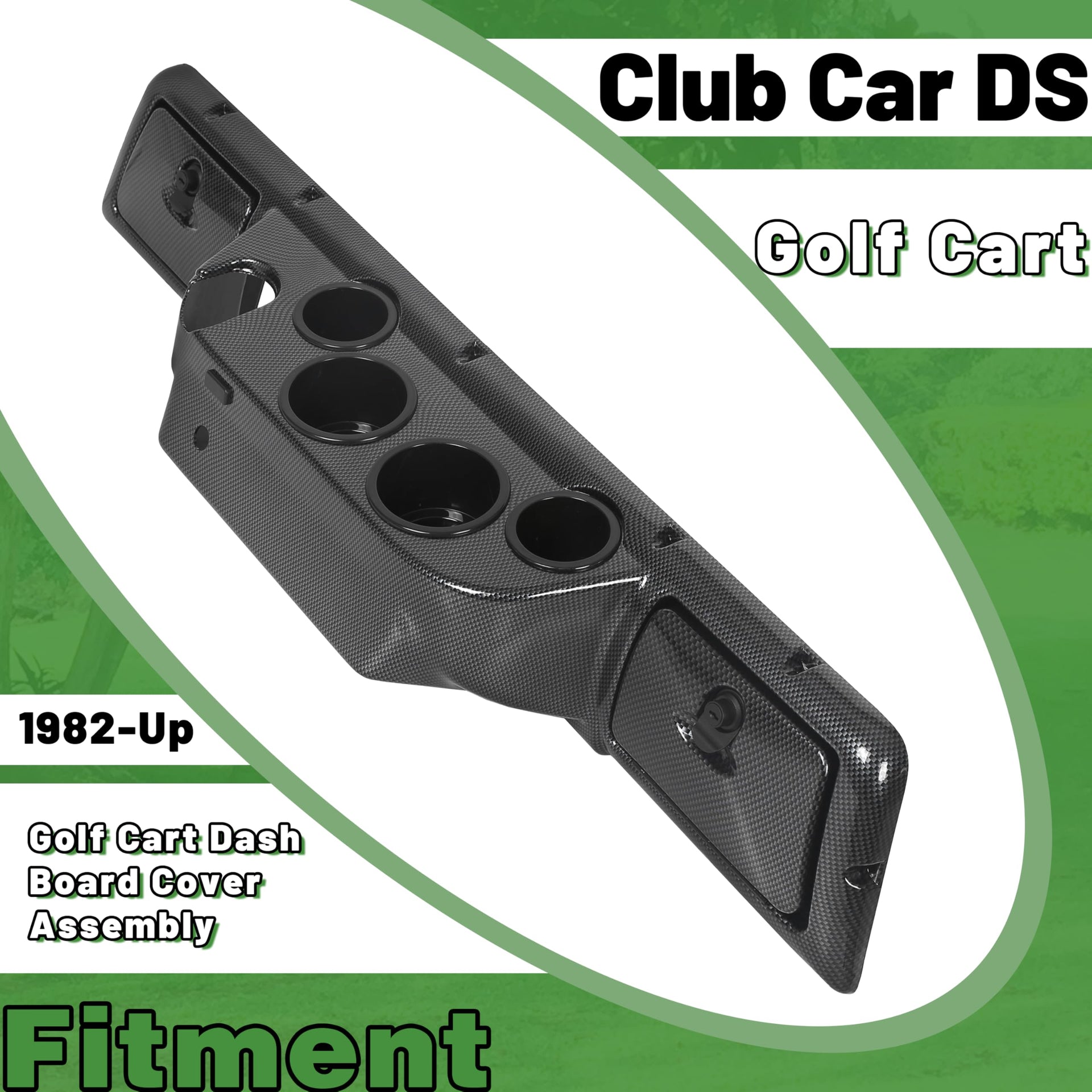 FITMENT - Compatible with 1982 and Up Club Car DS (Note: This dash will also compatible with most Club Car Carryall models). Direct replacement for previous Golf Cart Dash Board Cover. | FEATURE - Made of High Quality ABS Plastic Material. Color: Carbon Fiber Style. Placement on Vehicle: Front, Interior. | EXTRA STORAGE SPACE - The dashboard is designed with storage slots for drivers to store water bottles, keys, small items, and more. This allows you to conveniently store essential items and avoid clutter while driving. | PACKAGE INCLUDED - 1 x Dash Board Cover. Includes keys (As the pictures shown). Measurements: 42.5''W x 7''L x 8'' tall; 4 cup holders: two 4''W x 8'' tall; Side locks: 8''W x 5'' tall. | INSTALLATION - Professional installation is highly recommended. Note: Minor drilling to re-locate the key switch is required. Instructions & hardware NOT included.