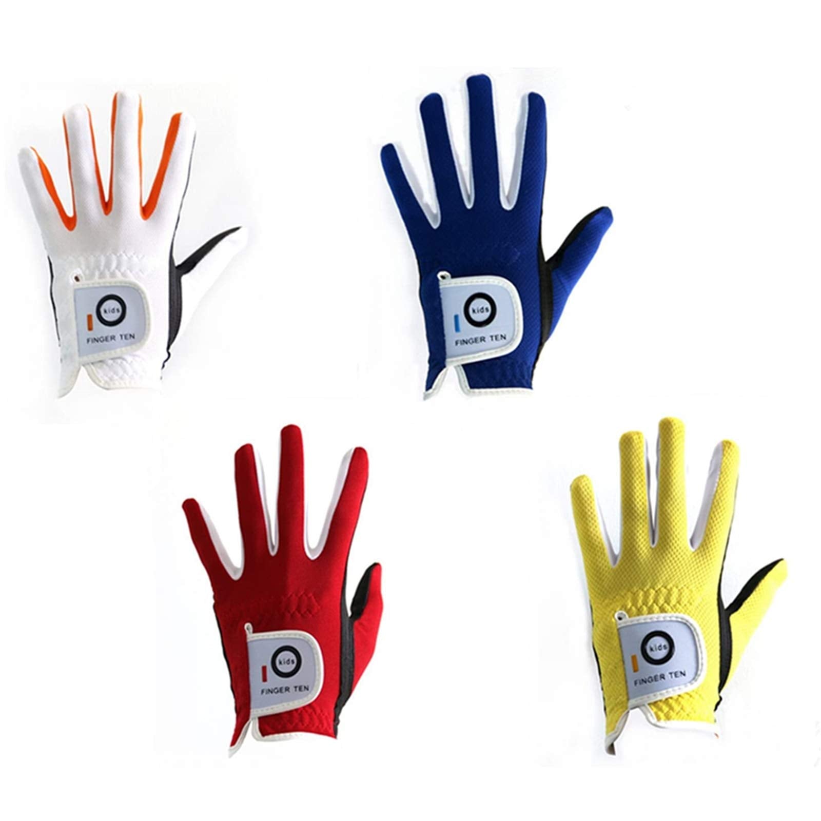 The Finger Ten Junior kids Dura Feel White Blue Red Yellow golf gloves Has the most enhanced synthetic leather for a great feel, grip and durability-3D performance coolon mesh for better breathability and a better range of motion-Just for a guidence: Small(for golfers from 3-5 years old) Medium(for golfers from 5-7 years old) Large (for golfers from 7-9 years old) XL(for golfers from 9-12 years old)-Extra Value 2 Pack