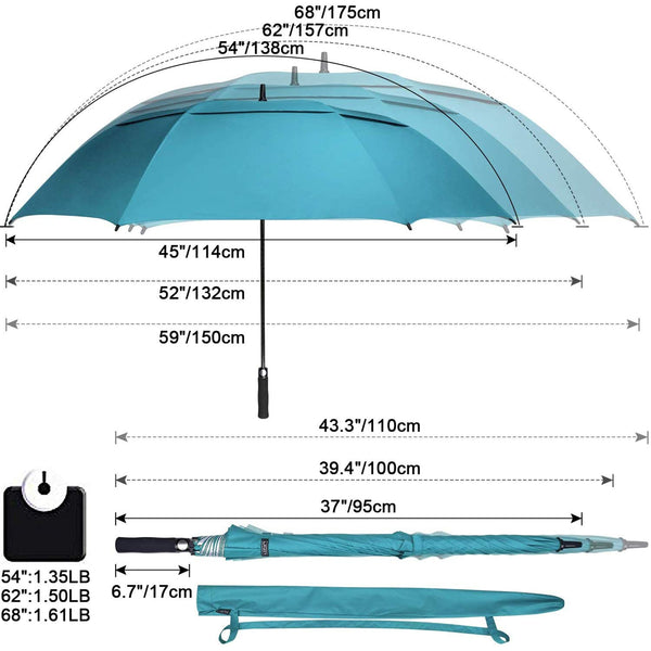 The Ultimate golf Umbrella Updated Material Ultra-high Density Pongee Fabric, a superior material than the polyester Fiberglass shaft A flexible material bend resistant and durable for lifetime performance Built to LastThe frame is constructed using hardened stainless steel coated in high quality black resin Ergonomic Designcomfortable EVA grip handle Single Hand OperationSimply press the button on the handle to open the canopy To return, manually pull with your hand until you can hear an audible click Windproof Lightweight & Durable We use high quality fiberglass for the tips and ribs, which is strong and flexible whilst not being so heavy that you hand fatigues customer ServiceAll our produced backed by excellent customer service We are here to serve you Package include: 1 X g4Free golf Umbrella 1 X carry Pouch with a Strap