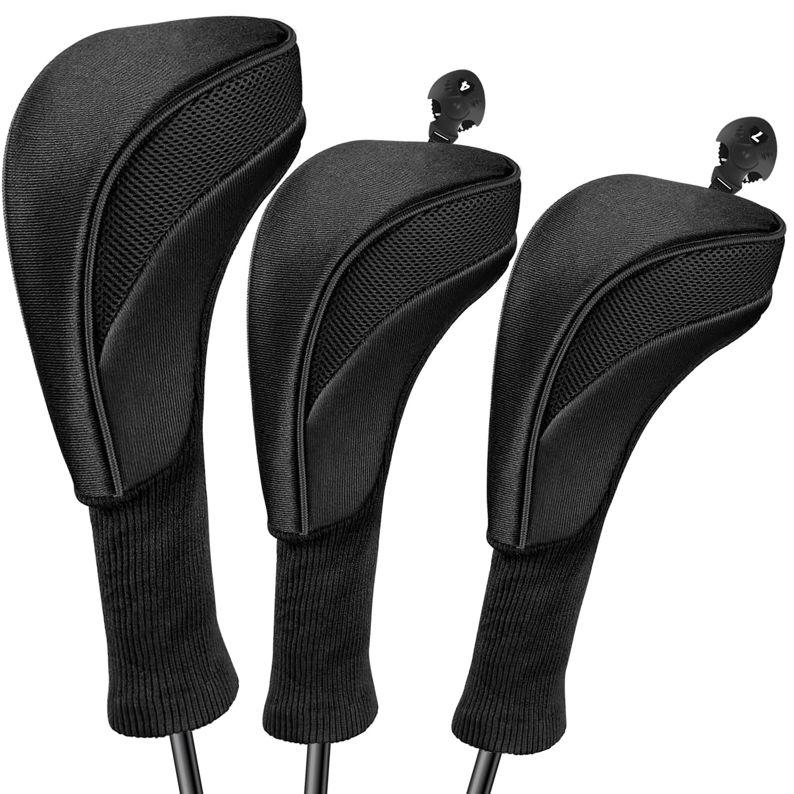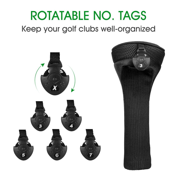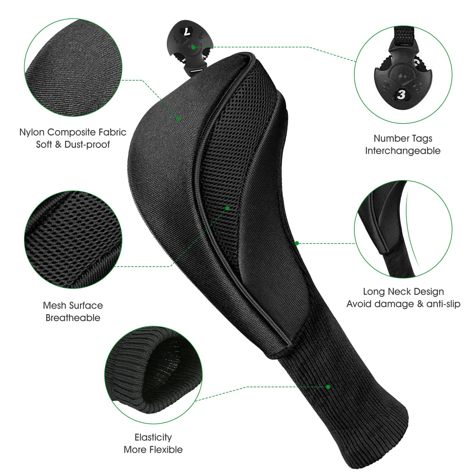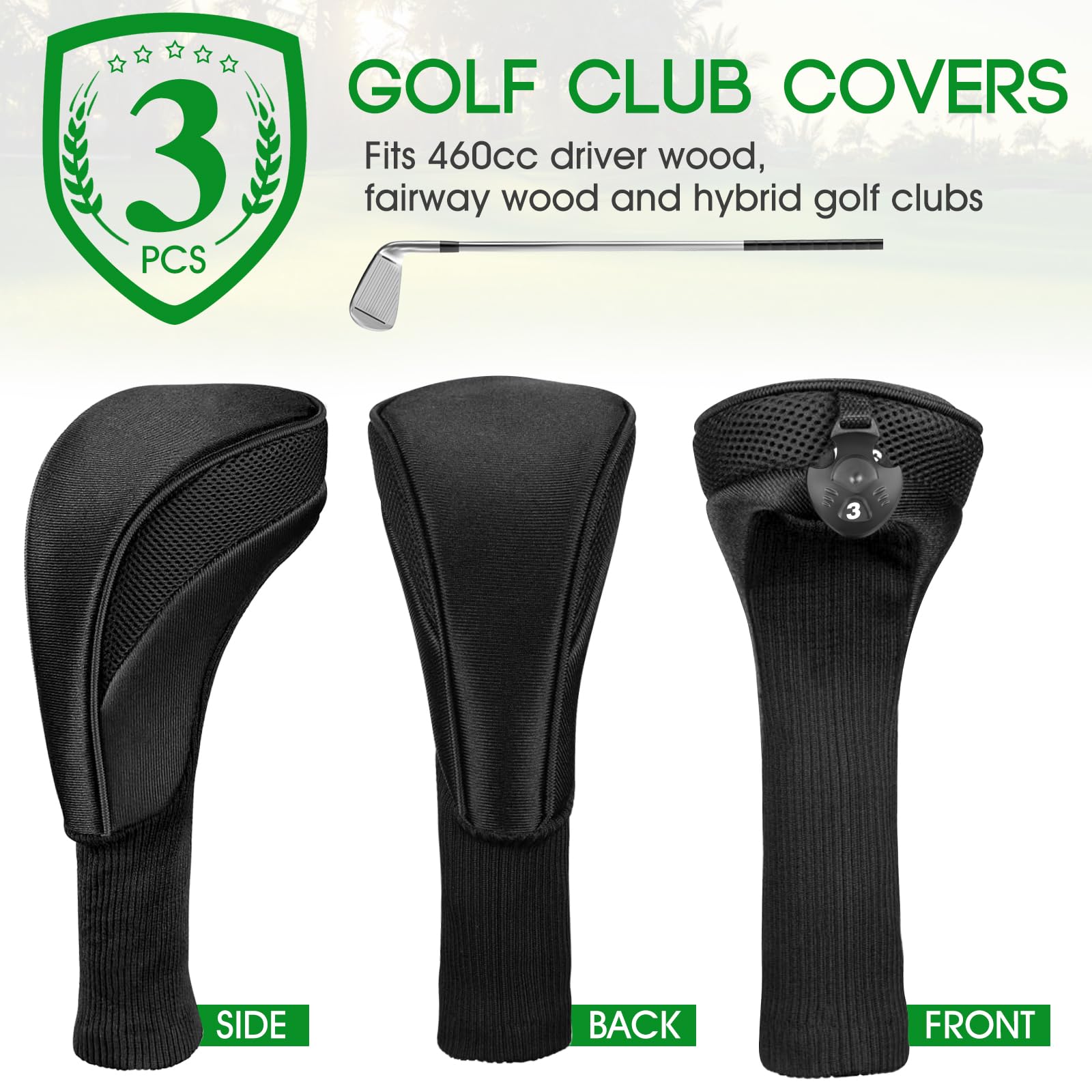 Golf Club Head Covers for No. 1, 3, 4, 5, 6, 7 & X Clubs Features: Applicable Golf Clubs Golf club head covers for woods fit all brands wood clubs, like: TaylorMade Callaway Titleist Ping Cobra Nike PXG Cleveland Wilson Reflex Big Bertha Cobra and others. A great gift for golfers, no matter men or ladies. Full Protective Effectively protect golf clubs from abrading, scratching and damaging that may occur during the game. It will provide the best protection for you clubs. Suitable for Multiple Clubs There are 3 golf club head covers. Two of them are suitable for 3, 4, 5, 6, 7 & X golf clubs and are labeled with numbers to help you identify the clubs, and the other is only applicable to No. 1 oversized club. More Flexible Our golf head cover has high elasticity and air permeability, which will provide a convenience to put on and take off the golf club head cover. Effective Dust-proof Our golf club headcovers are made of nylon composite fabric, which has great properties of dust-proof. Dont worry about getting dirty. Long Neck Design Long neck design will provide full protection and avoid club headcover slipping off. Classic modeling style leads the fashion trend. Specifications: Material: Nylon composite fabric Number: 3 pcs golf club head covers fit for No. 1, 3, 4, 5, 6, 7 & X clubs Package Included: 3 x Golf Club Head Covers