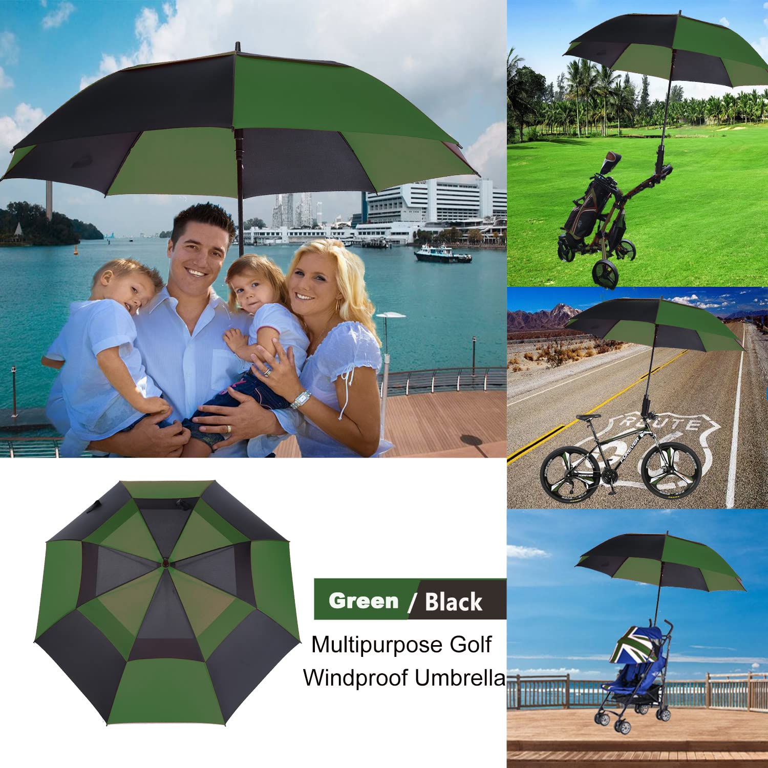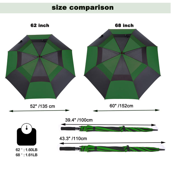 MRTLLOA 62 Inch Automatic Open Green/Black Golf Umbrella, Extra Large Oversize Double Canopy Vented Windproof Waterproof Sports Stick Umbrellas for Rain