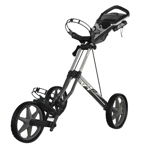 The redesigned handle allows for a larger mesh headcover tray,Built-in bracket holds the Speed Cart seat or an industrial sand/seed bottle holder,Mesh basket comes standard,Improved upper and lower bag brackets easily adjust to hold your bag,Folds in two easy steps