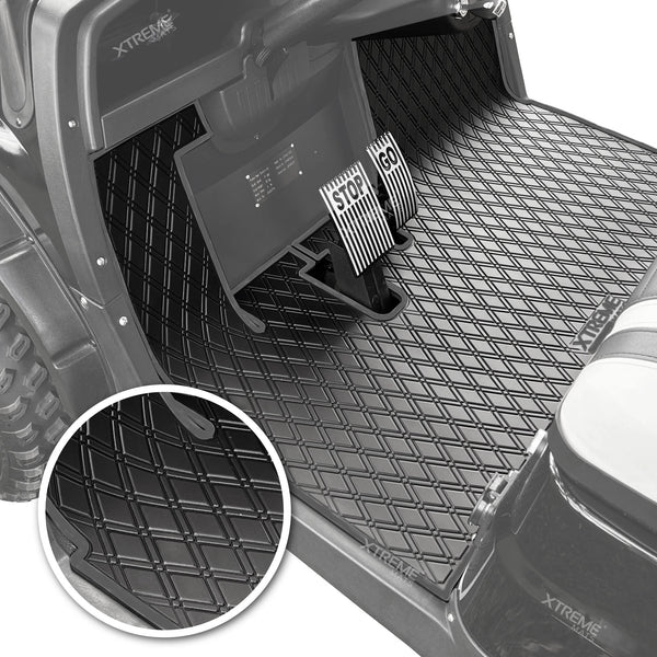 The ORIGINAL full-coverage golf cart mat in the industry. Our golf cart mats are custom made to fit most cart makes and models. We only produce the most advanced golf cart floor & surface protection. Our digital laser measurements ensure our golf cart mats fit your vehicle perfectly and our heavy-duty, 8-mm rubber will not slide around or become dislodged over rough terrain.?We feature a wide range of colors to help match almost any cart modification or upgrade.?Feel free to contact us and suggest a trim color to accent or complement your paint, accessories,?and seats. Were the ORIGINAL after-market golf cart mat in the industry to offer full coverage for your entire floor area-from the dash to seat- including the 2nd row on many 6 passenger golf carts.?We now offer Xtreme Mats for almost any surface on your golf cart including dashes, bag wells, cargo areas, and rear foot rests.
