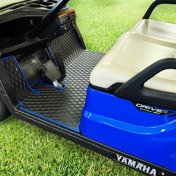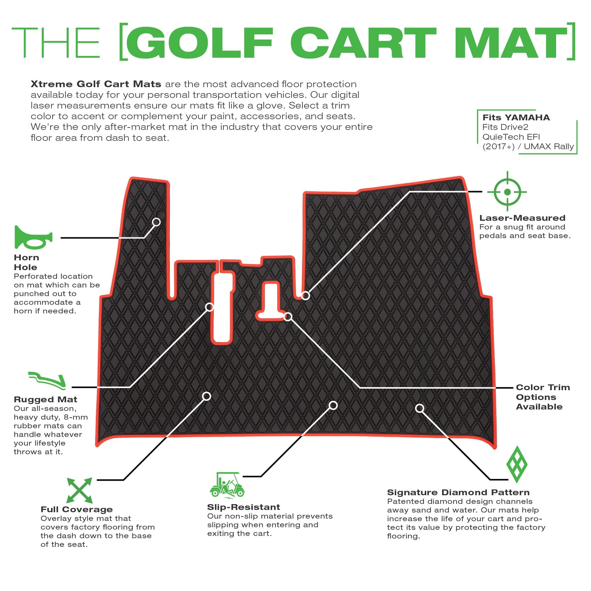 The ORIgINAL full-coverage golf cart mat in the industry Our golf cart mats are custom made to fit Yamaha, E-Z-gO, club car, IcON, and Advanced EV cart models We only produce the most advanced golf cart floor & surface protection Our digital laser measurements ensure our golf cart mats fit your vehicle perfectly and our heavy-duty, 8-mm rubber will not slide around or become dislodged over rough terrainAWe feature a wide range of colors to help match almost any cart modification or upgradeAFeel free to contact us and suggest a trim color to accent or complement your paint, accessories,Aand seats Were the ORIgINAL after-market golf cart mat in the industry to offer full coverage for your entire floor area-from the dash to seat- including the 2nd row on many 6 passenger golf cartsAWe now offer Xtreme Mats for almost any surface on your golf cart including dashes, bag wells, cargo areas, and rear foot rests