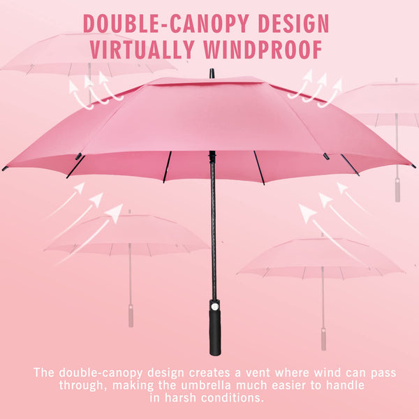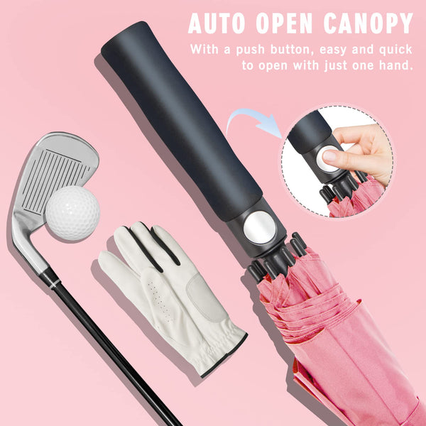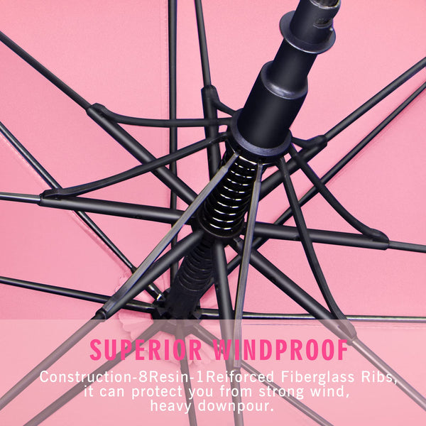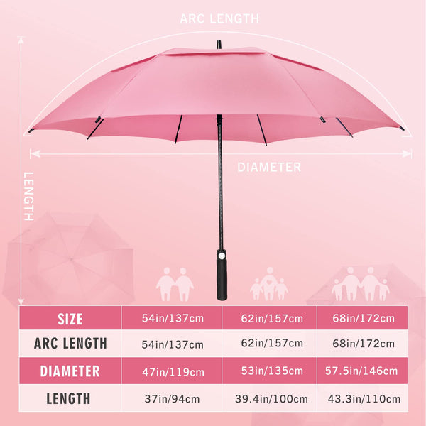 Automatic Open Golf Umbrella ZOMAKE umbrellas are designed by business professionals for golf, sports, formal occasions, and everyday life. At ZOMAKE, we build a better rain umbrella - stylish, reliable, durable, and highly wind resistant. Through continuous innovation and careful engineering of every component, we provide our customers with the highest quality product at an everyday value price. Features: Automatic Open Mechanism 8 resin, reinforced fiberglass ribs made of hardened stainless steel coated Wind Proof Frame 210T pongee fabric, Lightweight Water-resistant material Heavy Duty Fiberglass Shaft Cane-style Ergonomic Comfort-grip Handle Oblique-styled Storage Pouch Umbrella Dimensions - Closed Length: 43.3 in., Canopy Arc: 68 in., Coverage Diameter: 59 in., Weight 1.6 LB. One-Year Peace of Mind Replacement Guarantee
