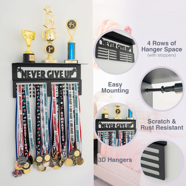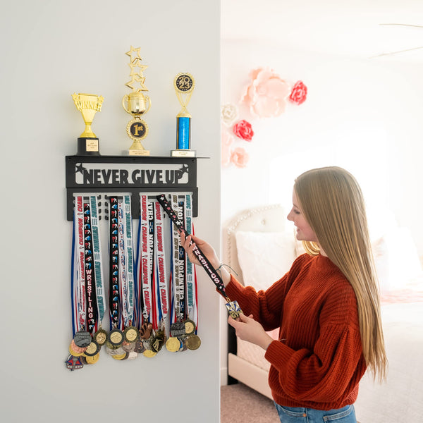 medal hanger display, medal hanger, trophy and medal display shelf, medal holder, medal hanger display with shelf, medal rack, medal holder for wall, trophy display shelf, medal display hanger, running medal hanger display, gymnastics medal holder, trophy shelf with hooks for medals, marathon medal display, soccer medal hanger display, race medal holder wall hanger, medal display shelf, medals holder display, sports medal hanger, medal holders for sports, hangers for medals, metal holder for medals