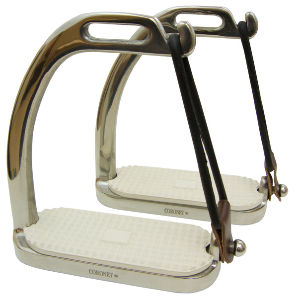 Peacock Safety Stirrup Irons with Pad by Coronet Think safety First. Use the replacement leather loops and rubber bands either straight or for a snugger fit you can twist them. Stirrup pads and rubber bands included. Stainless Steel. Sold as a pair. Choose Foot Sizes: 3 1/2, 4, 4 1/4, 4 1/2 or 4 3/4.