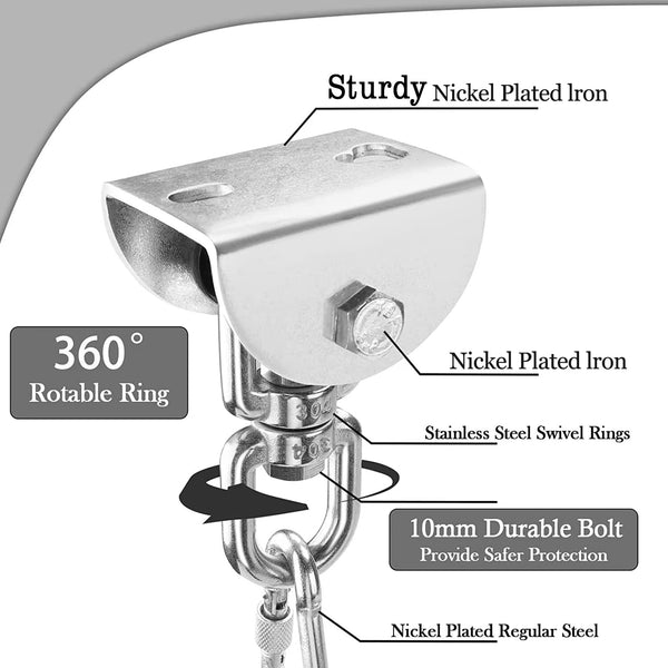 ENSURE SAFETY AND STABILITY -- Made of high-grade nickel-plated iron, corrosion resistant and durable Fully support heavy bags up to 1000 lbs SWIVEL SMOOTHLY -- The specially made nylon bushing provides a better experience Make sure the heavy bag swivels silently and smoothly EASY INSTALLATION -- Include one heavy bag hanger, a pair of bolts for the wood beam, and a spare carabiner Just drill the holes and screw our bolts you will finish the installation in 5 minutes UNIVERSAL DESIgN -- great for all-size kick Boxing, Muay Thai Bag, swing sets, porch swings, sling swings, spinner seats, or any other swinging device for a playground swing set