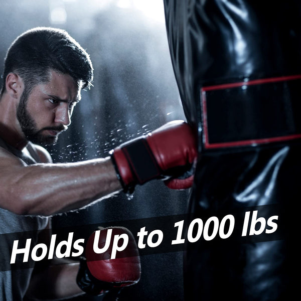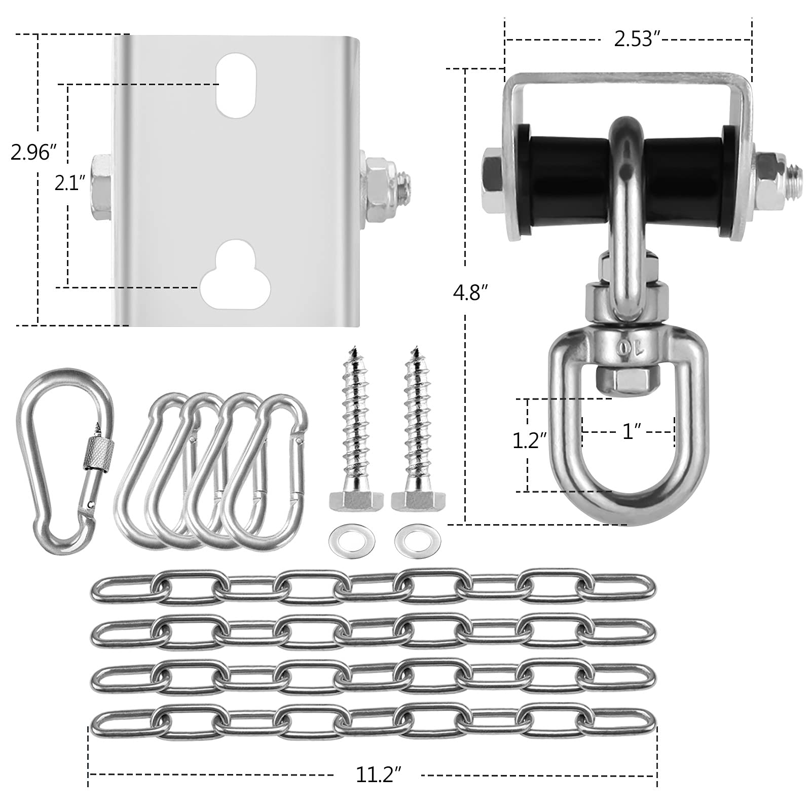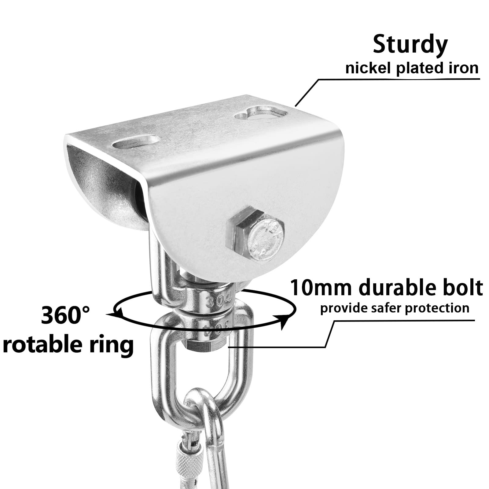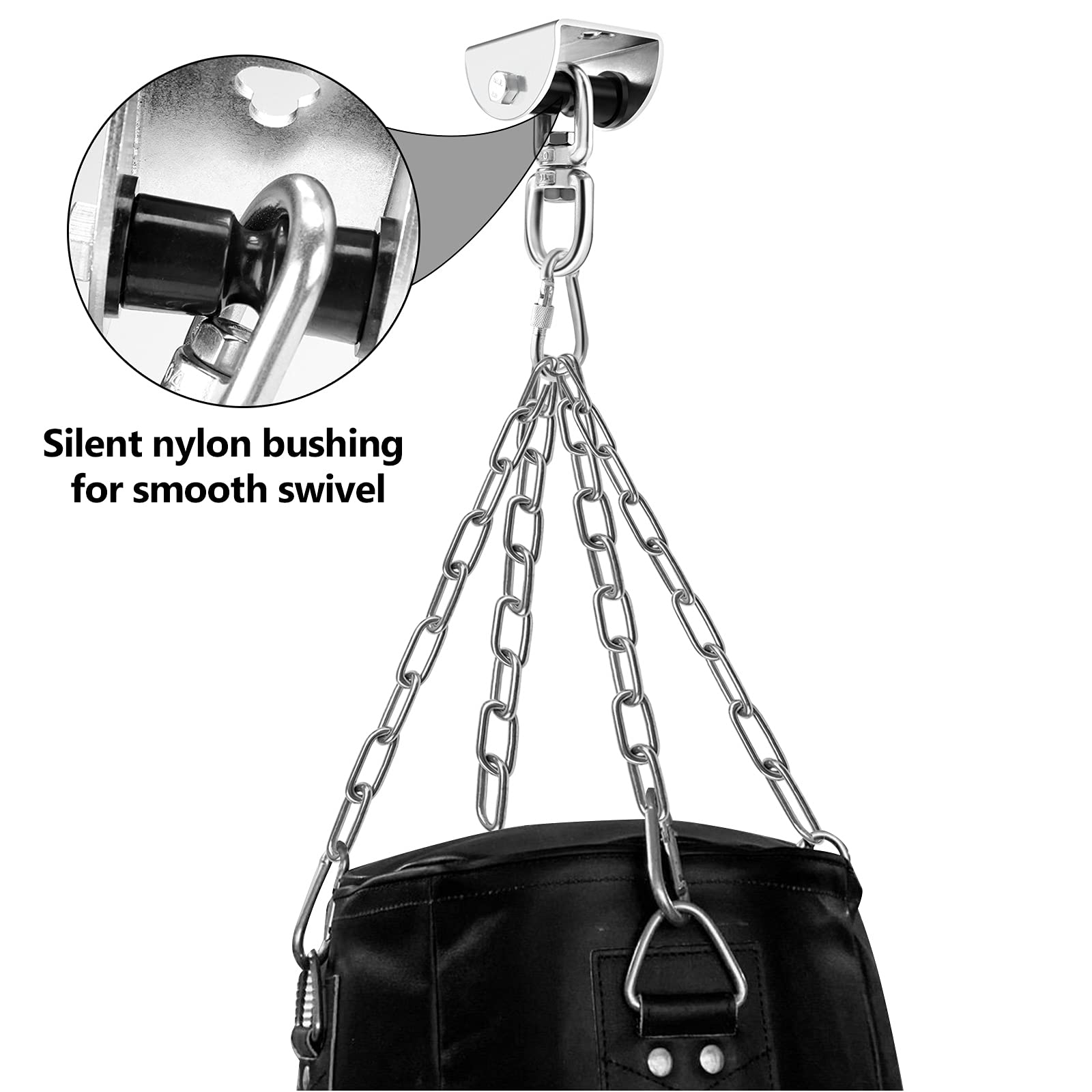 ENSURE SAFETY AND STABILITY -- Made of high-grade nickel-plated iron, corrosion resistant and durable Fully support heavy bags up to 1000 lbs SWIVEL SMOOTHLY -- The specially made nylon bushing provides a better experience Make sure the heavy bag swivels silently and smoothly EASY INSTALLATION -- Just drill the holes and screw our bolts you will finish the installation in 5 minutes UNIVERSAL DESIgN -- great for all-size kick Boxing, Muay Thai Bag, swing sets, porch swings, sling swings, spinner seats, or any other swinging device for a playground swing set WHAT YOU gET -- Include one heavy bag hanger, a pair of bolts for wood beam,5 carabiners, and 4 galvanized iron chains