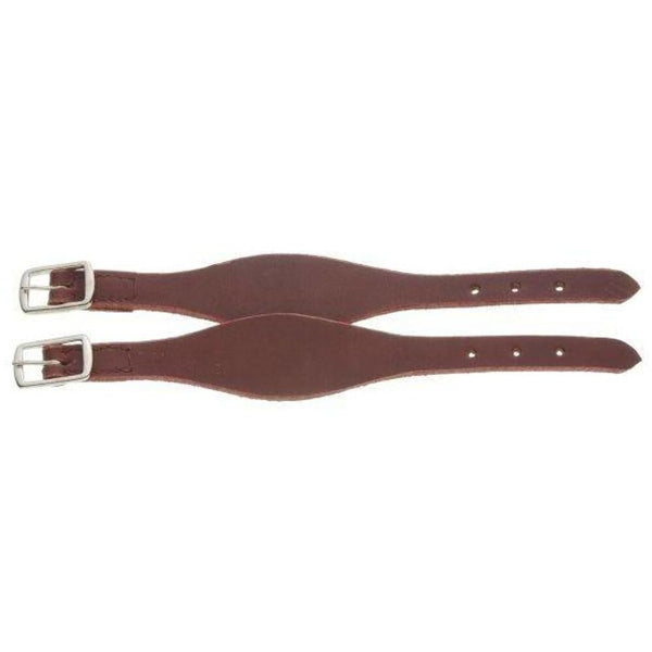 Tough-1 Shaped Stirrup Hobble Straps These durable stirrup Hobble Straps from Tough 1(R) widen to 2'' at the center. Quality crafted from rugged leather. Sold as a pair. Features: Fasten around stirrup leather just above the stirrup Durable Adjustable Nickle Buckles Item Specifications: Color: Dark Oil Size: 12'' L x 3/4'' W