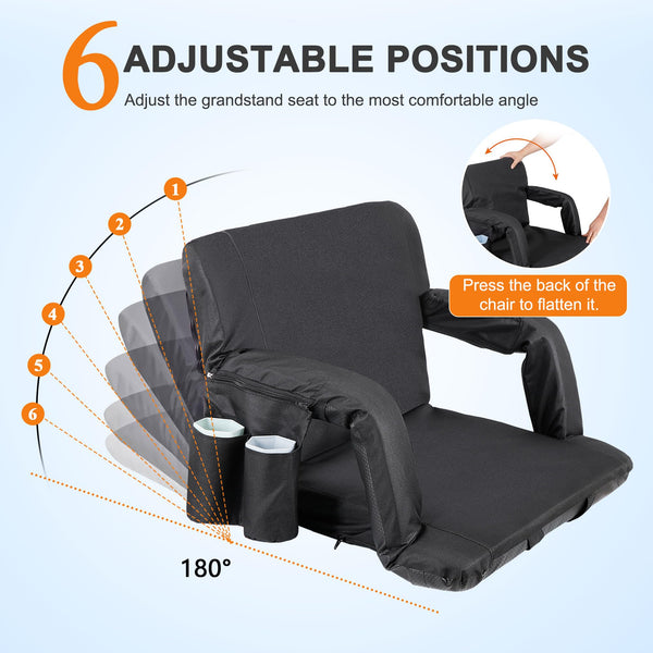 Enjoy the Entire Game in Comfort. This comfortable, portable padded seat is so versatile, Enjoy reclining at the beach, sitting at the park, sporting events, camping, bleachers and more!It comes with 6 reclining positions, adjustable backpack style straps for easy carrying and padded armrests for extra comfort. It can be adjusted to completely flat so you can easily store it in your closet or just place it under your sofa when you don't use it. Features: Durable polyester-covered padded cushion with sturdy steel frame Water resistant and non-skid bottom 5 adjustable positions and optional armrest Folds flat for stores easily Backpack straps are easy for carry Specifications: 6 Reclining Positions Item Color: Black Item Weight: 8.49 lb Seat Depth: 15.75'' Seat Width: 18.9''