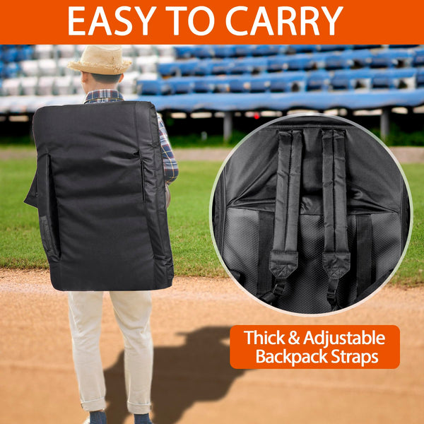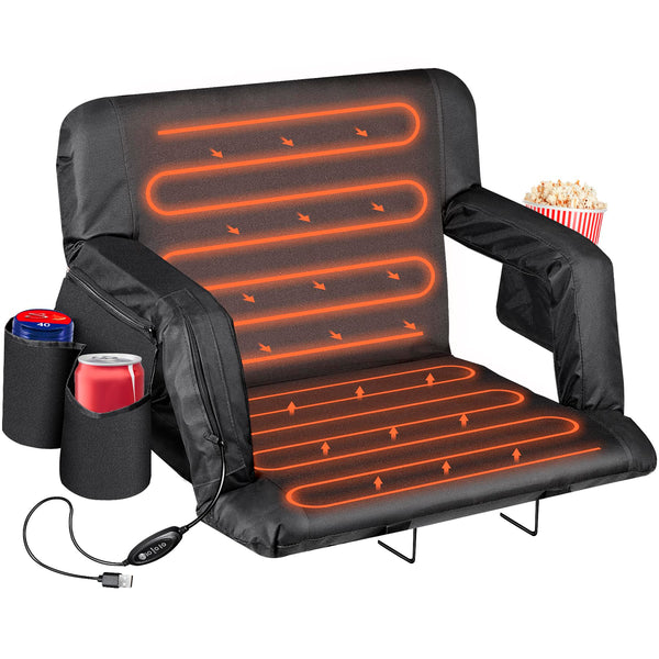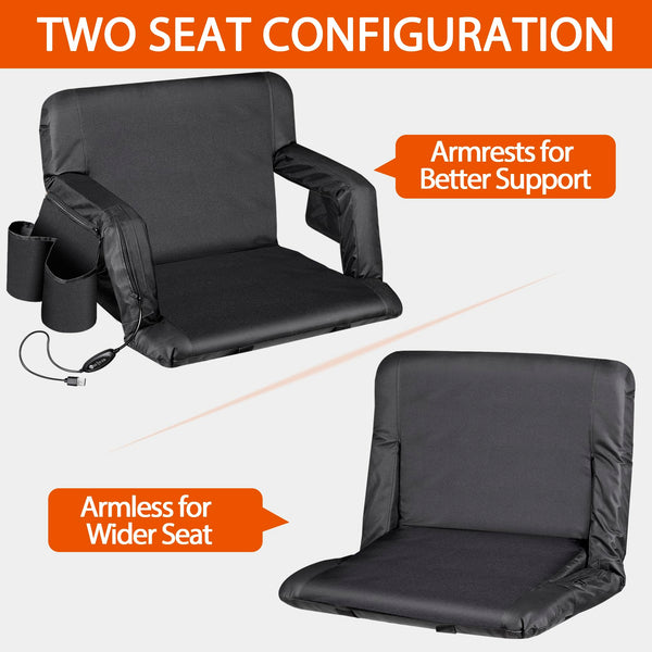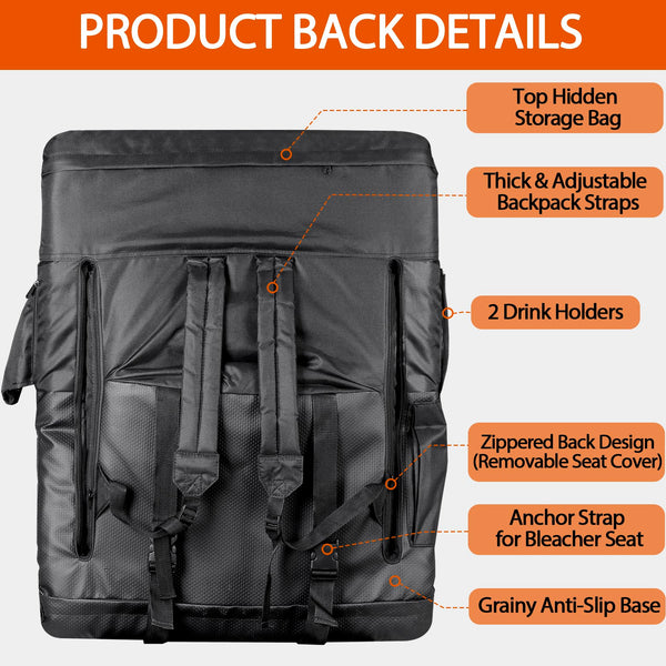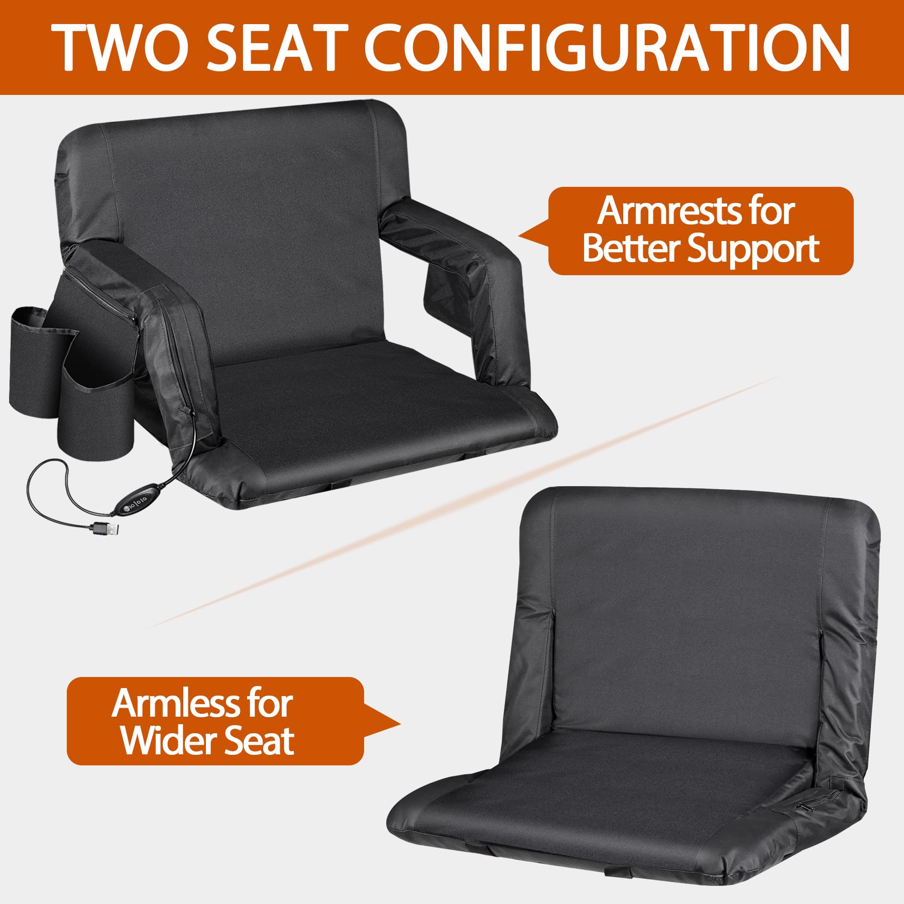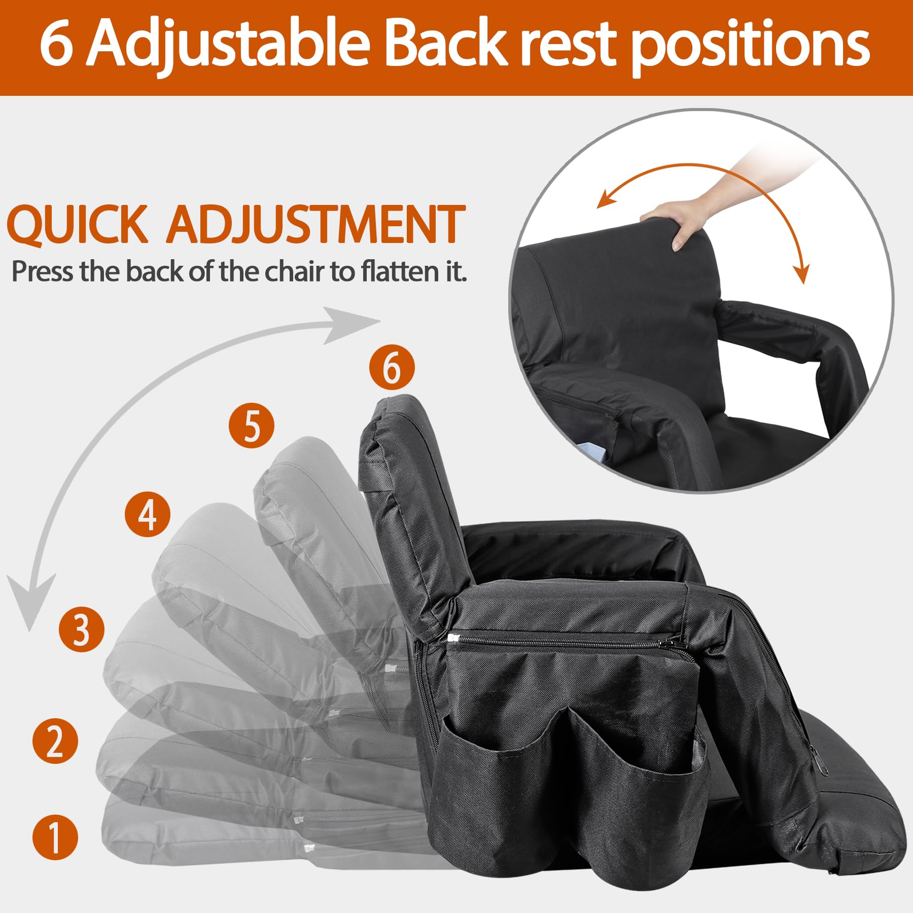 Enjoy the Entire Game in Comfort. This comfortable, portable padded seat is so versatile, Enjoy reclining at the beach, sitting at the park, sporting events, camping, bleachers and more!It comes with 6 reclining positions, adjustable backpack style straps for easy carrying and padded armrests for extra comfort. It can be adjusted to completely flat so you can easily store it in your closet or just place it under your sofa when you don't use it. Features: Durable polyester-covered padded cushion with sturdy steel frame Water resistant and non-skid bottom 6 adjustable positions and optional armrest Folds flat for stores easily Backpack straps are easy for carry Specifications: 6 Reclining Positions Item Color: Black Item Weight: 8.8lbs Seat Depth:15.75'' Seat Width:18.5''Back Support:24.8''x18.4'' Item Material: steel + 600D polyester + cotton + PVC Folded Dimensions: 17.1''Lx25.2''Wx17.7''HFlat Dimensions: 31.9''Lx25.2''Wx3.3''HPackage include: 1 x Reclining Seat2 x Hooks