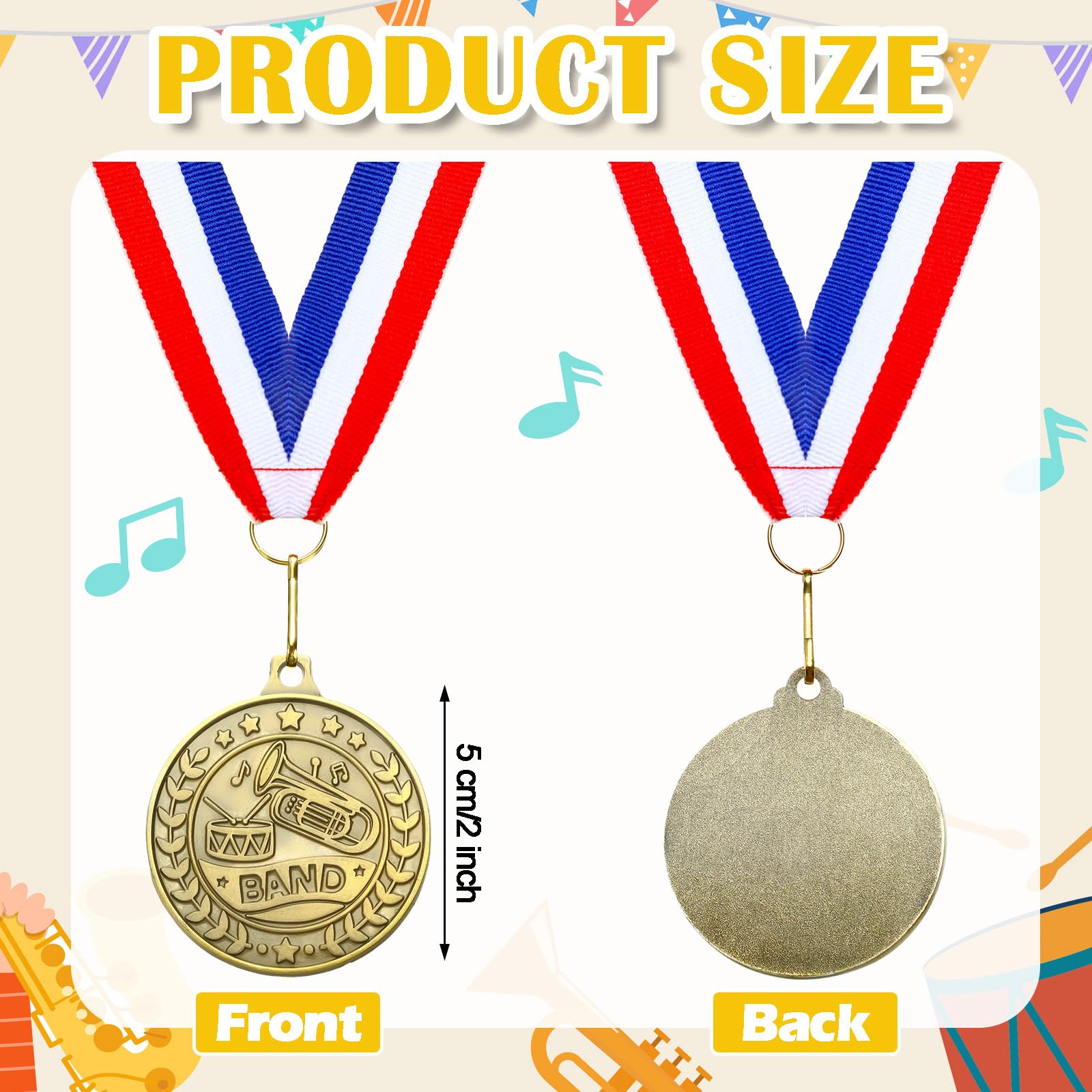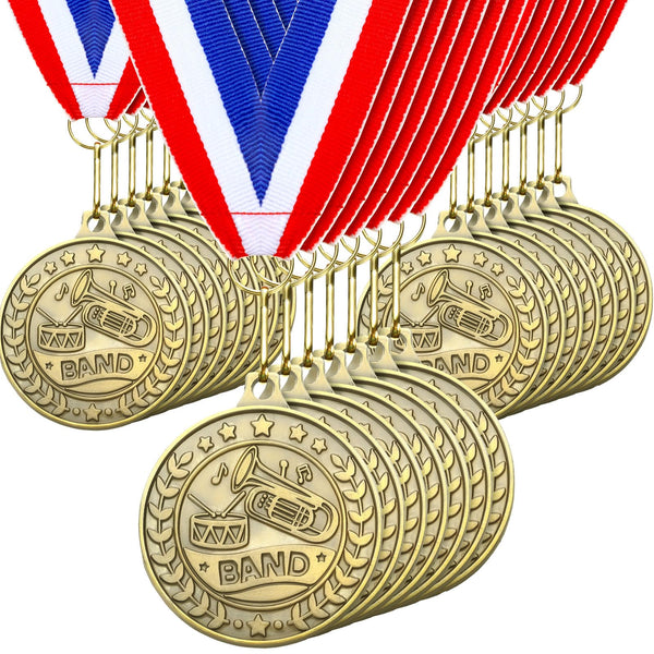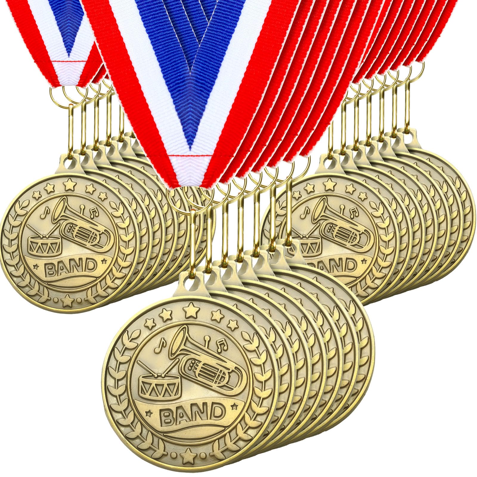 Features: A gold Kudos Music Band medal for kids adults isn 't just a reward. It 's recognition of hard work, dedication, and talent. Our medals are appropriate for making every winner, whether in school competitions or sports events, glow with pride. Whether it 's a party, tournaments, competitions, these participation trophies make a prestigious and meaningful award and this pack of 30 ensures there 's enough to go around. Specifications: Material: mainly metal Color: gold medal with white, red, blue neck ribbons Size: about 2 inches/ 5 cm in medal diameter Package includes: 30 x Kudos Music Band Award medals Notes: Manual measurement, please allow slight errors on size. The color may exist a slight difference due to different screen displays.