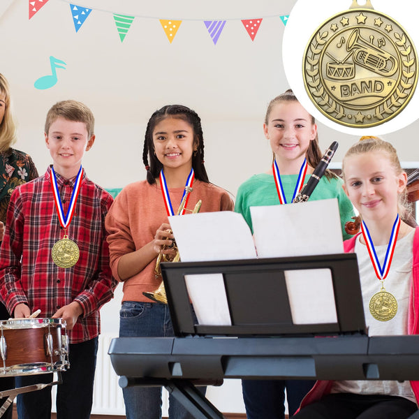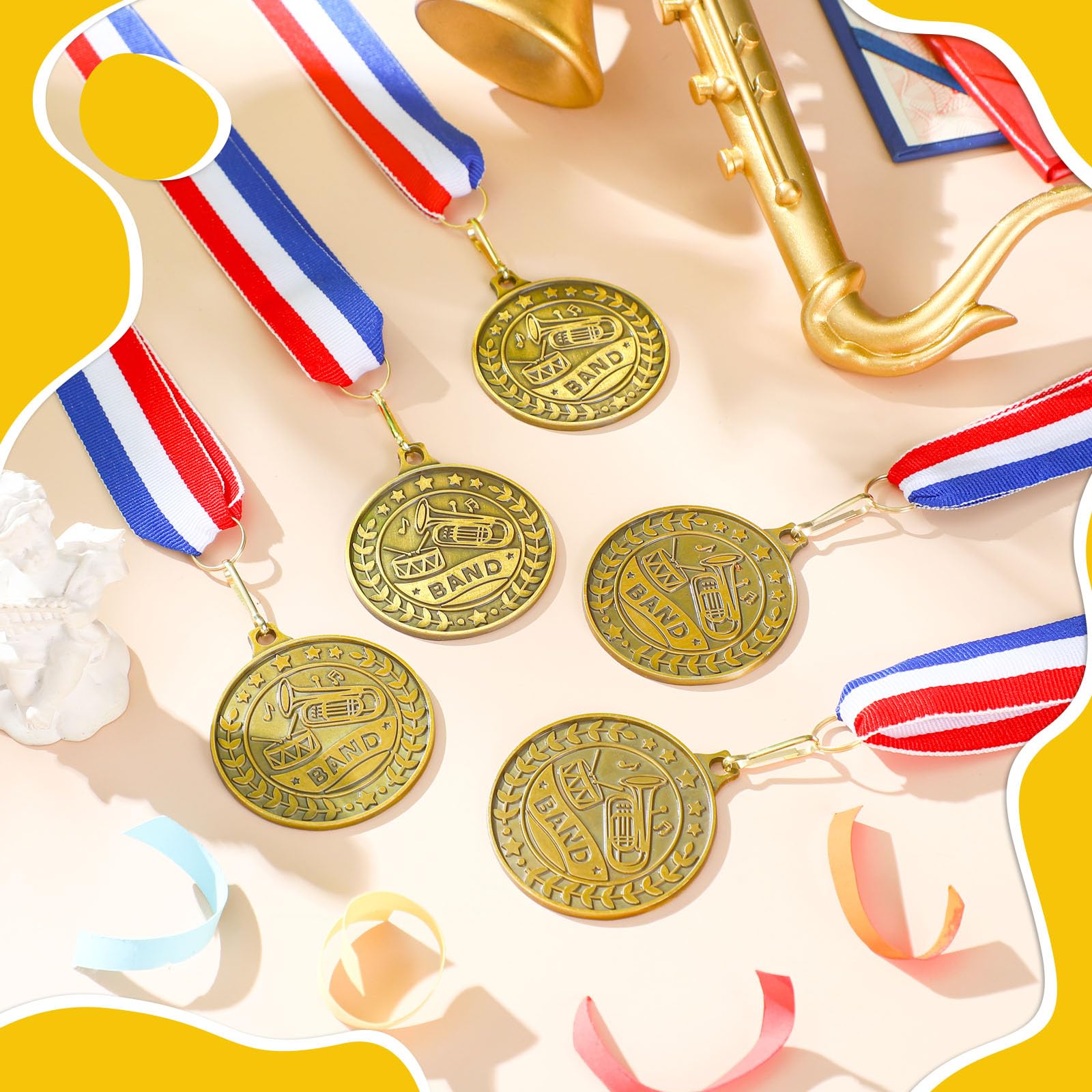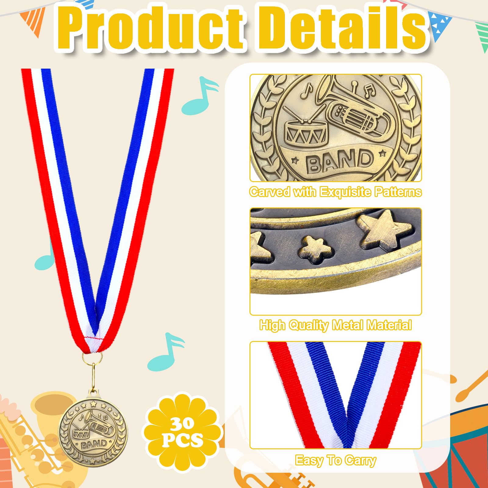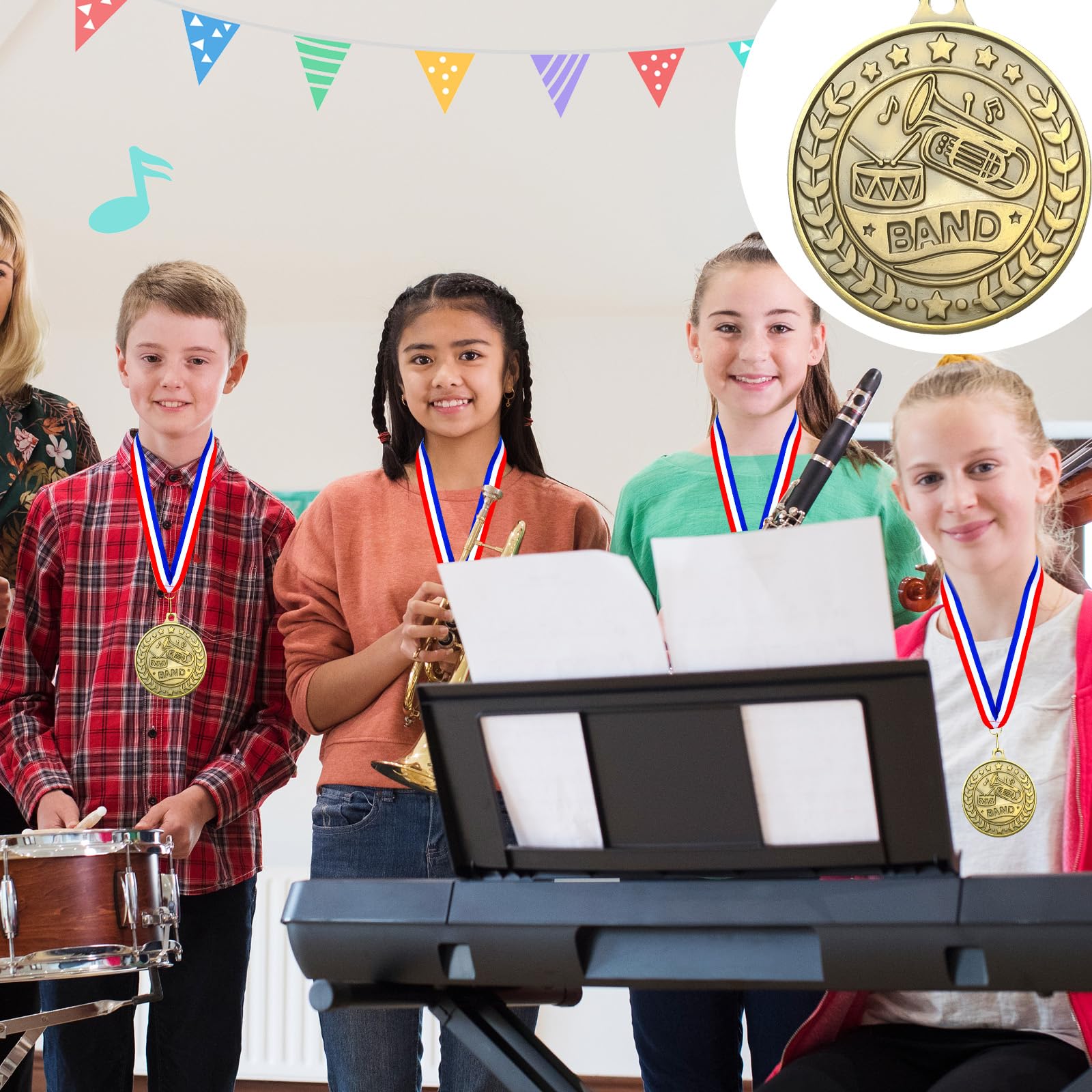 Features: A gold Kudos Music Band medal for kids adults isn 't just a reward. It 's recognition of hard work, dedication, and talent. Our medals are appropriate for making every winner, whether in school competitions or sports events, glow with pride. Whether it 's a party, tournaments, competitions, these participation trophies make a prestigious and meaningful award and this pack of 30 ensures there 's enough to go around. Specifications: Material: mainly metal Color: gold medal with white, red, blue neck ribbons Size: about 2 inches/ 5 cm in medal diameter Package includes: 30 x Kudos Music Band Award medals Notes: Manual measurement, please allow slight errors on size. The color may exist a slight difference due to different screen displays.