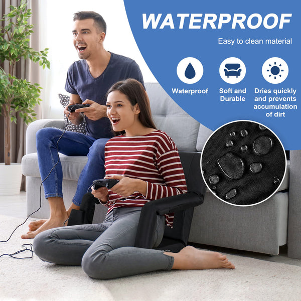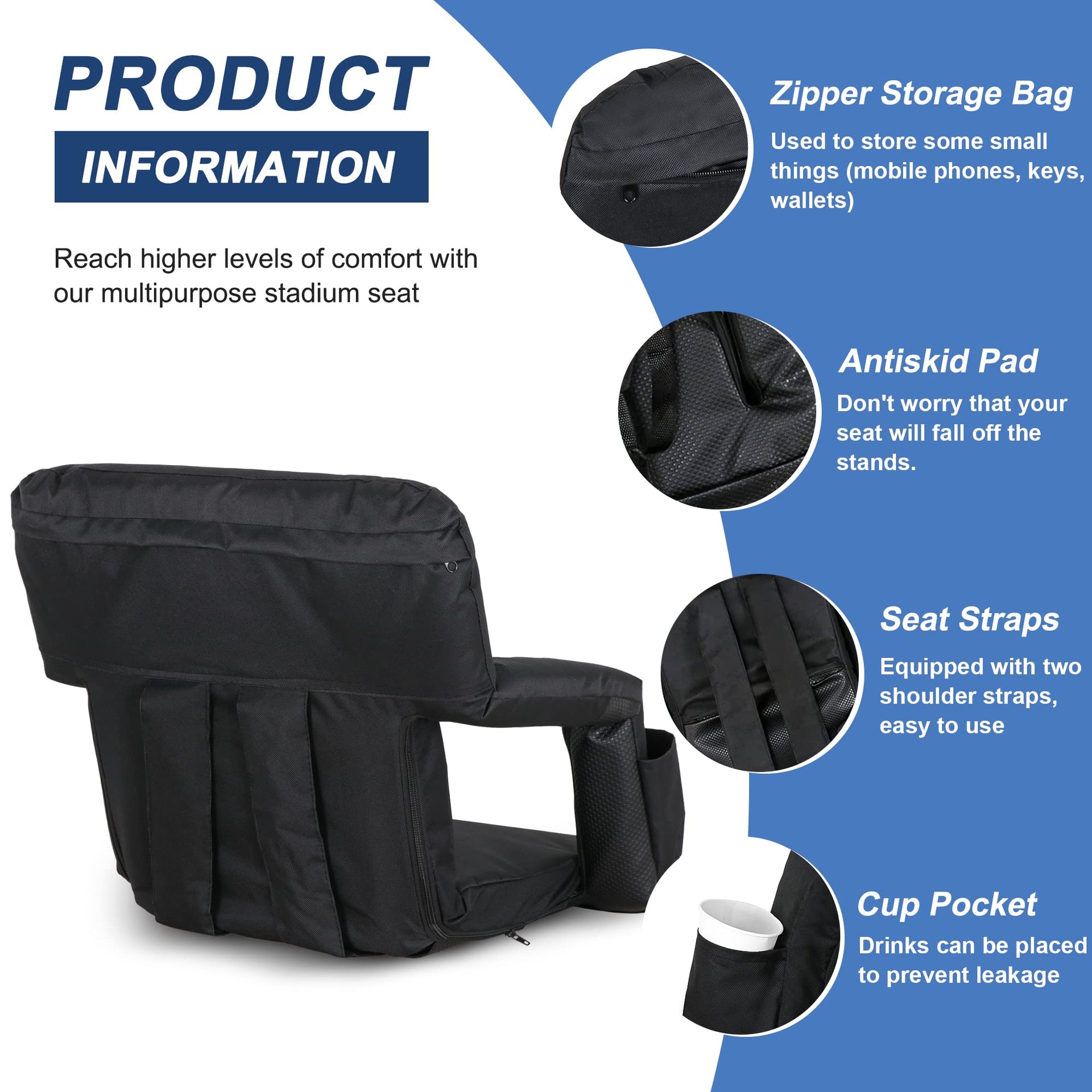 Enjoy the Entire game in comfort This comfortable, portable padded seat is so versatile, Enjoy reclining at the beach, sitting at the park, sporting events, camping, bleachers and moreIt comes with 6 reclining positions, adjustable backpack style straps for easy carrying and padded armrests for extra comfort It can be adjusted to completely flat so you can easily store it in your closet or just place it under your sofa when you dont use it Features: Durable polyester-covered padded cushion with sturdy steel frame Water resistant and non-skid bottom 5 adjustable positions and optional armrest Folds flat for stores easily Backpack straps are easy for carry Specifications: 6 Reclining Positions Item color: BlackRedBlue Item Weight: 401kg 884lb Seat Depth: 39 cm 153 Seat Width: 40 cm 157 Arm Rest Width: 7 cm 27 Back Support:54 x 41 cm 212 x 161 chair Pocket:13H x 7D cm 51H x 27D Item Material: steel + 600D polyester + cotton + PVc Folded Dimensions: 82 x 54 x 55 cm 322 x 212 x 21 Seat Dimensions: 48 x 40 x 52 cm 188 x 157 x 204 Package include: 1 x Reclining Seat