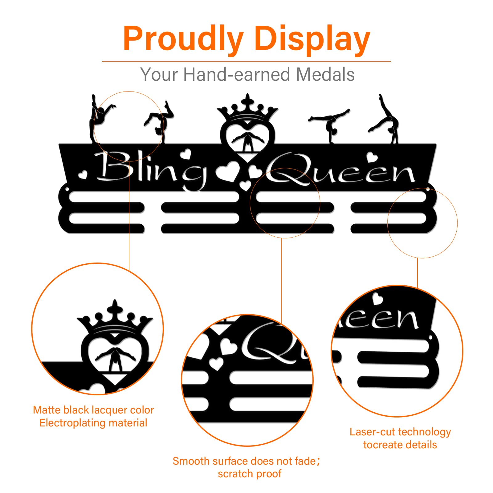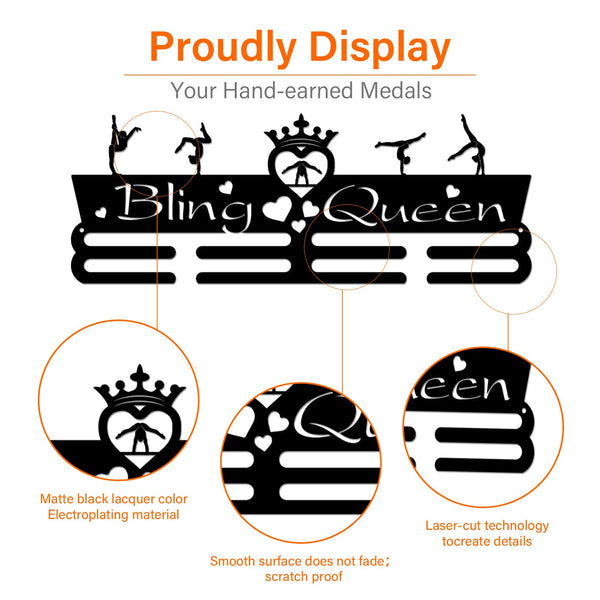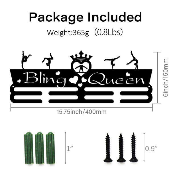Description: SUPERDANT Medal Holder Gymnastics Medals Display Motivating Word ''Bling Queen'' Black Iron Wall Mounted Hooks Specifications: Material:Iron Color:Black Quantity:1Set Size:about 15.75 inch(40cm) long, 5.91 inch(15cm) wide. Features: It can hanging your Gymnastics Medal display hanger with easy! It is a perfect gift for friend or family or for your kids ,celebrating the beautiful memories with your loved ones. Note: Color might be slightly different from the picture because of different display device; Picture may appear larger on your screen.
